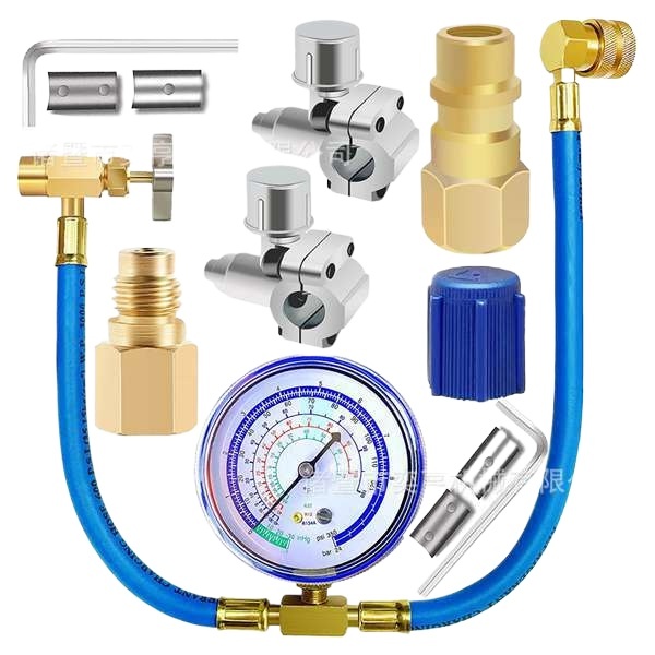 - 전체 키트: Includes a refrigerant charging hose, copper connectors, aluminum quick couplers, pressure gauge, and other essential accessories for comprehensive AC maintenance.