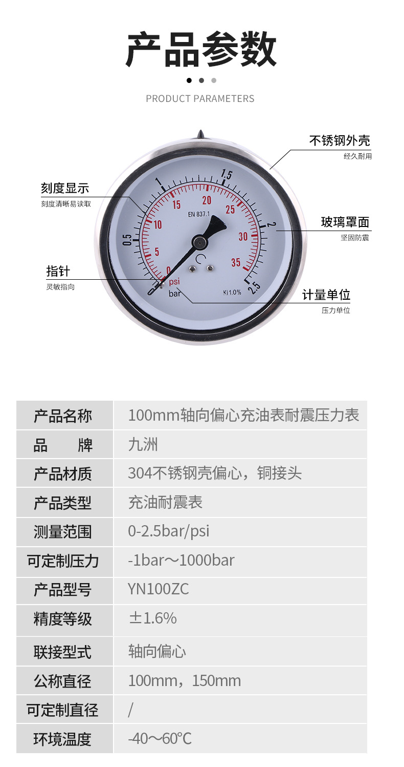 - Key Specifications: Features a 100mm (4-inch) dial with a measurement range of 0-2.5 bar/psi and ±1.6% accuracy, compliant with EN 837.1 standards.