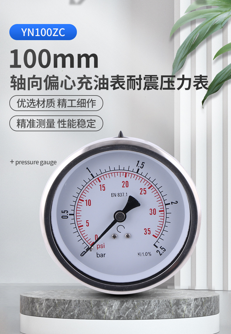 100mm Axial Eccentric Oil-Filled Pressure Gauge with Stainless Steel Case and Copper Connection for HVAC Systems, 4-inch Dial, YN100ZC