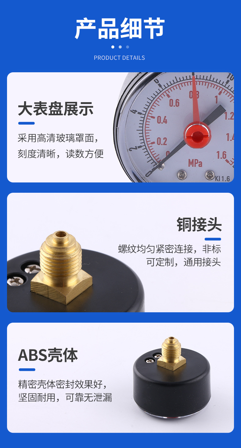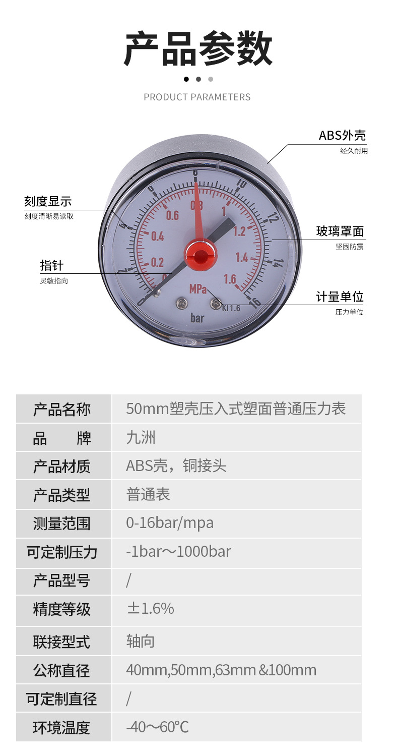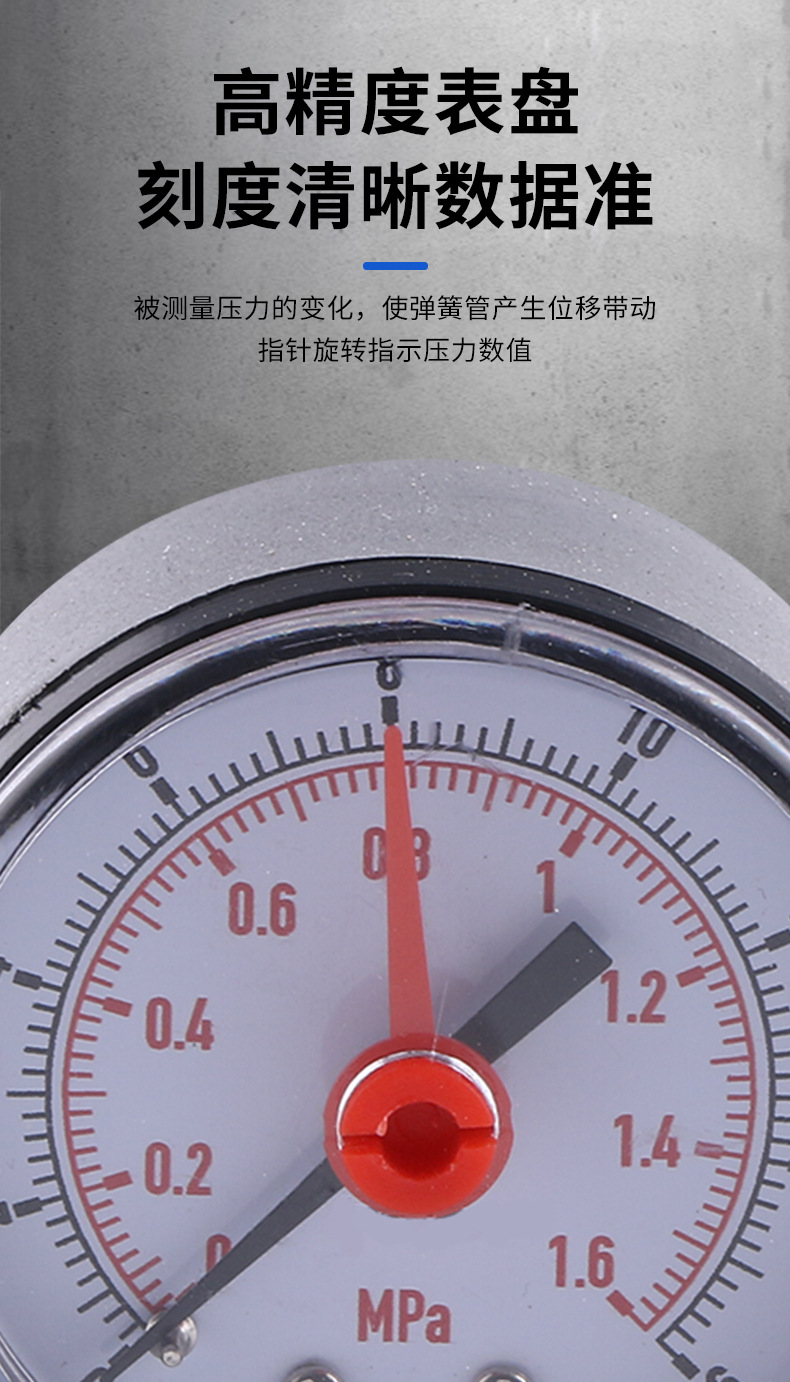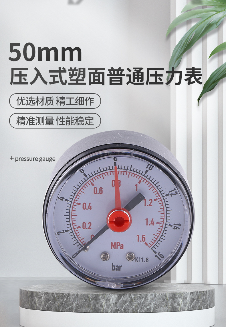 50mm Pressure Gauge with Adjustable Red Pointer, 0-1.6MPa/bar, Axial Connection, KI 1.6 Accuracy for HVAC Systems