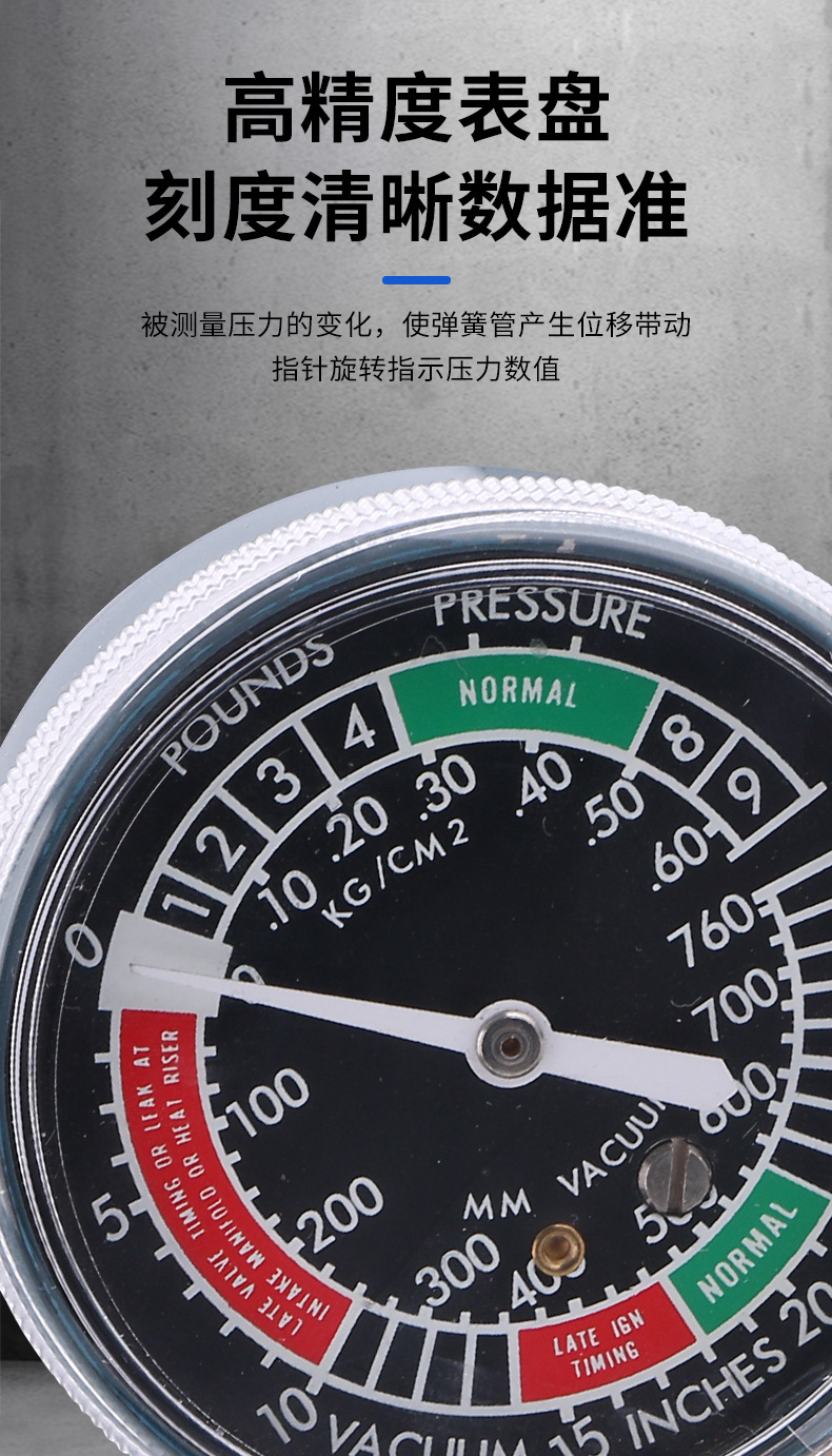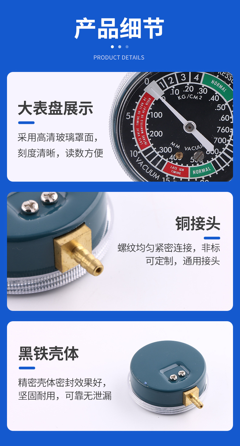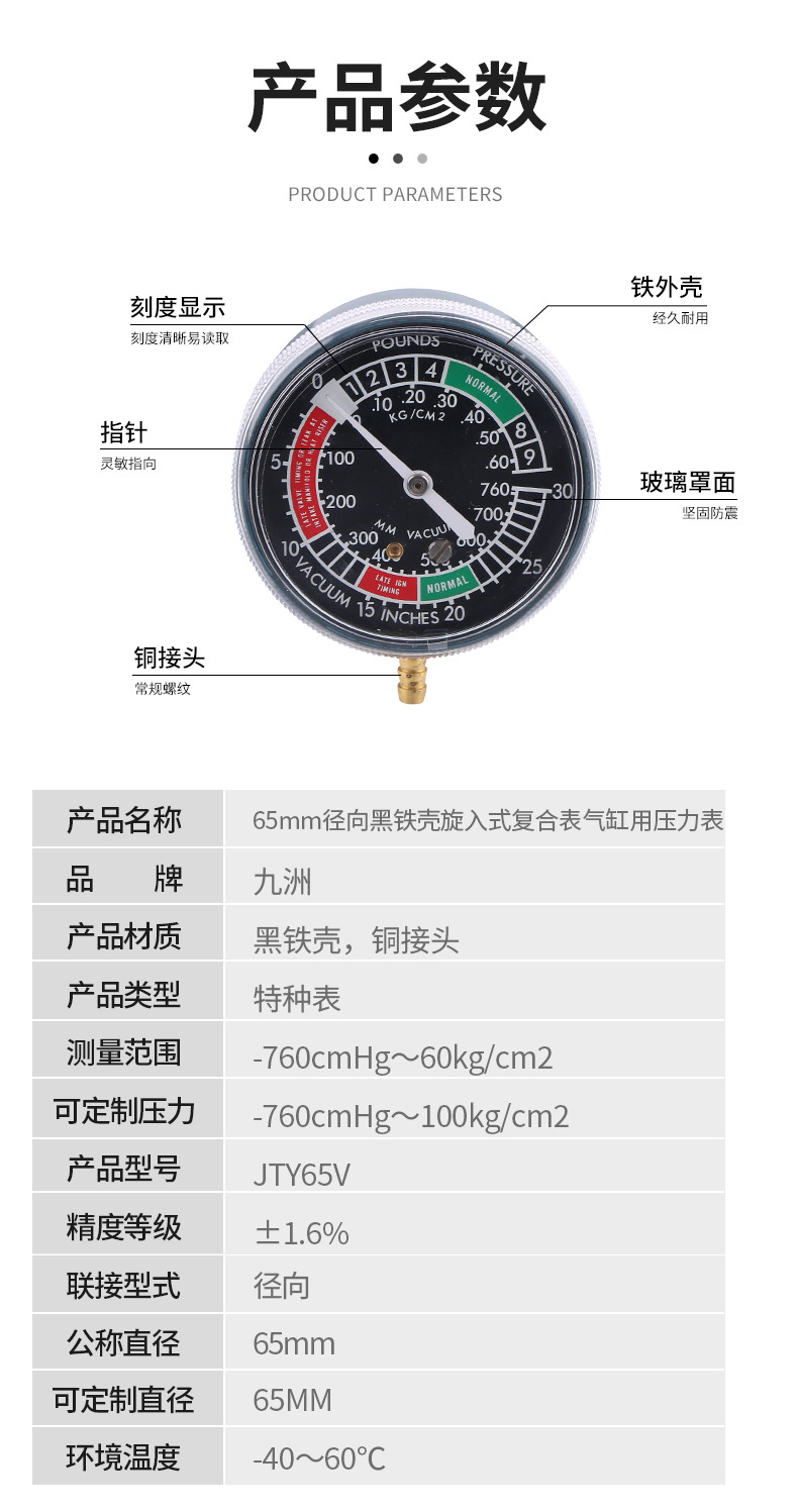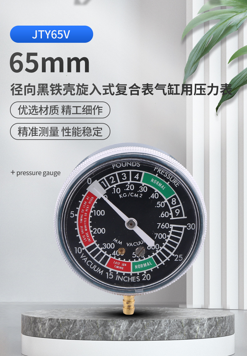 - Compatibility: Model JTY65V, a versatile compound gauge pressure meter, suitable for different cylinder and HVAC system applications requiring precise pressure and vacuum measurements.