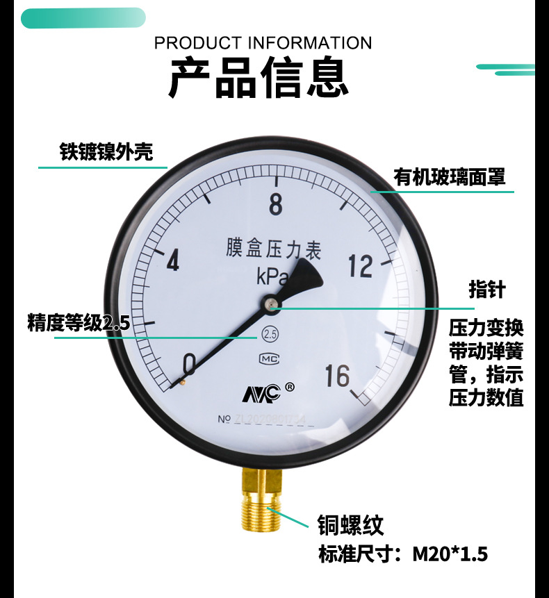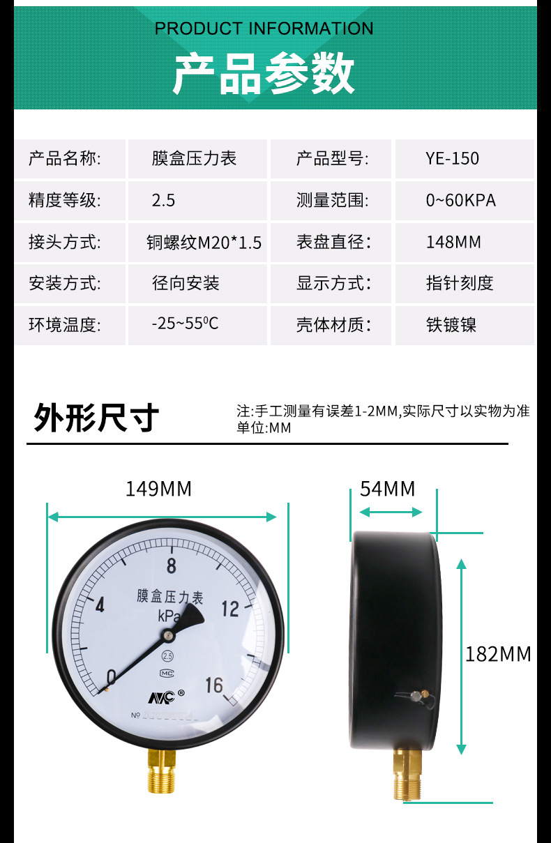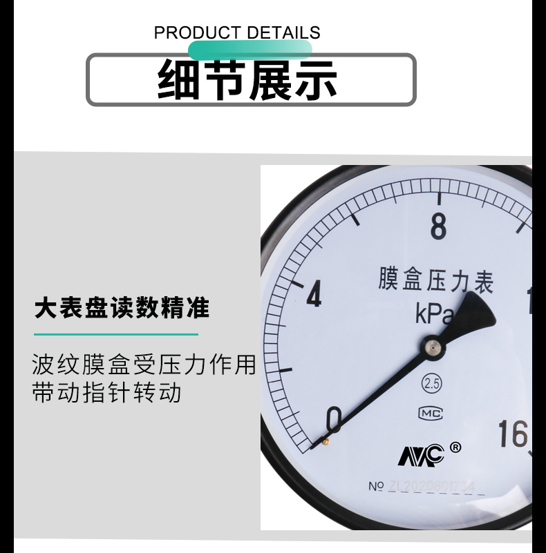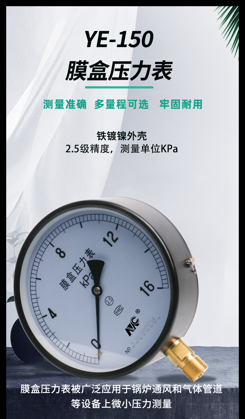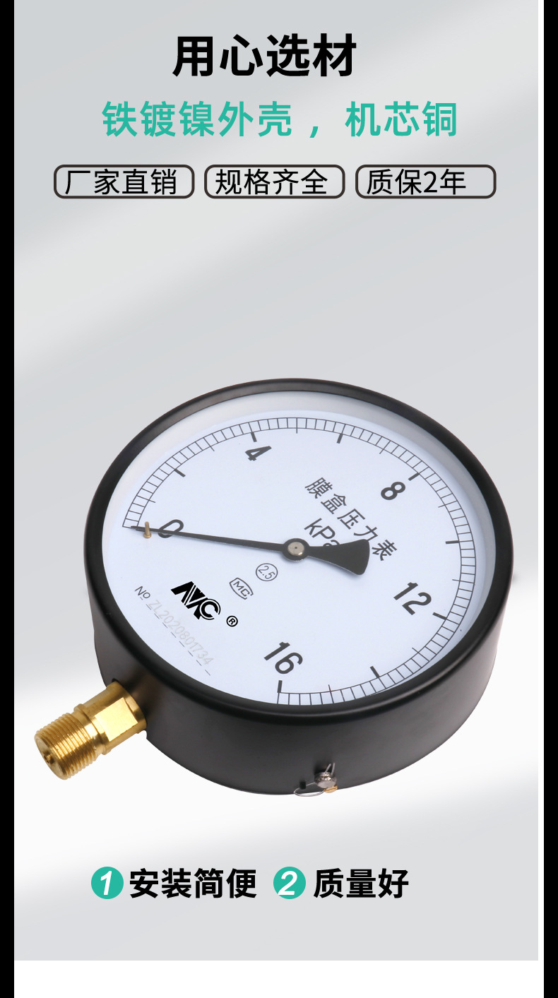 AMC YE150 Diaphragm Pressure Gauge 0-16 kPa HVAC Gauge for Water, Gas, Oil, Heating Systems, Replaces Standard Pressure Meters