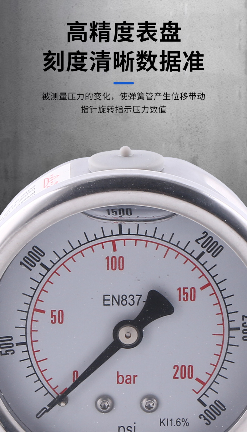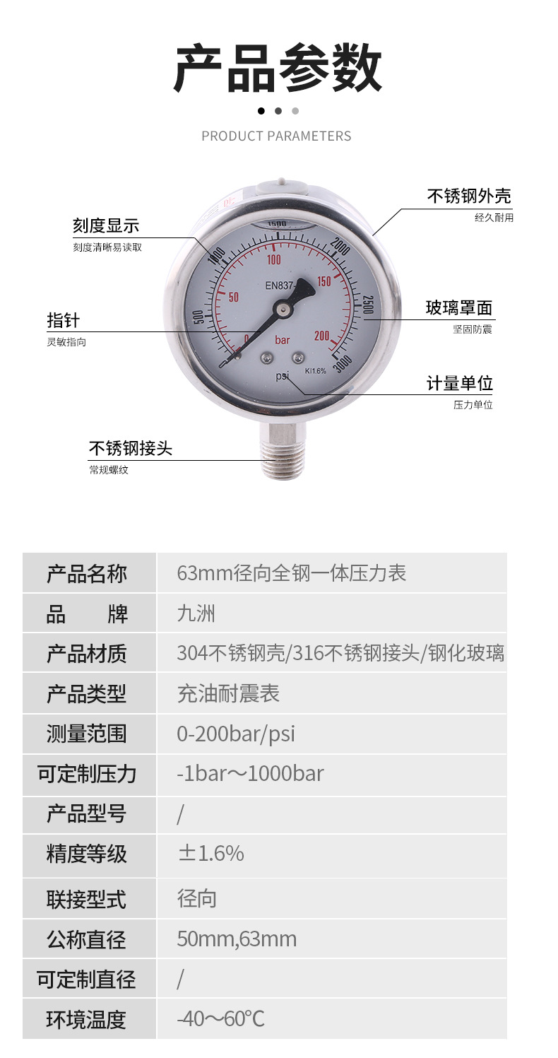 - Key Specs & Performance: Features 63mm radial mounting, measuring range of 0-200 bar/psi, and an accuracy level of .6% (EN837 K1.6%), providing precise and reliable readings.
