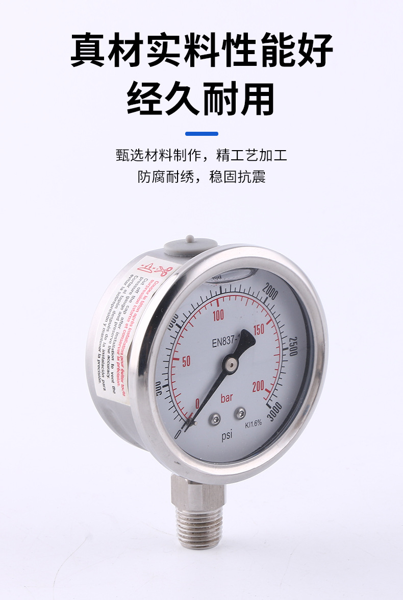 All Stainless Steel Pressure Gauge 63mm Radial, EN837, 0-200bar/psi, 1.6% Accuracy for HVAC Systems