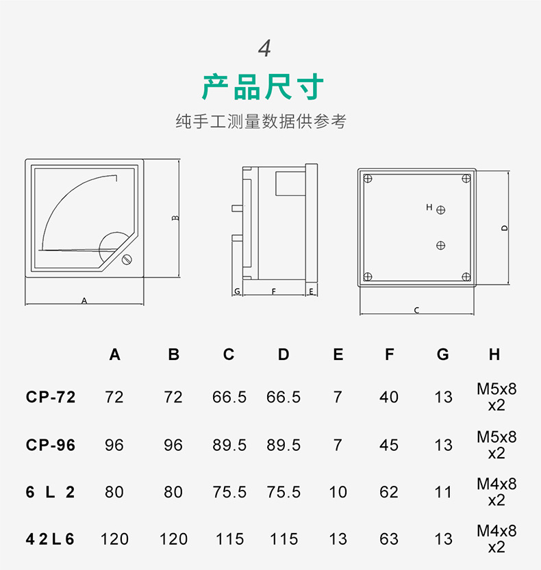 - Key Specs & Performance: Features 1.5% accuracy with measurement ranges of 45-55Hz or 45-65Hz. Multiple sizes (42L6: 120x120mm, 6L2: 80x80mm, CP-72: 72x72mm, CP-96: 96x96mm) cater to diverse installation needs.