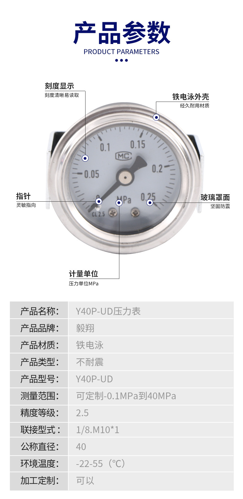 - Wide Compatibility: Y40P-UD pressure gauge is ideal for various applications including water, air, hydraulic, and oil pressure systems, ensuring versatile use.