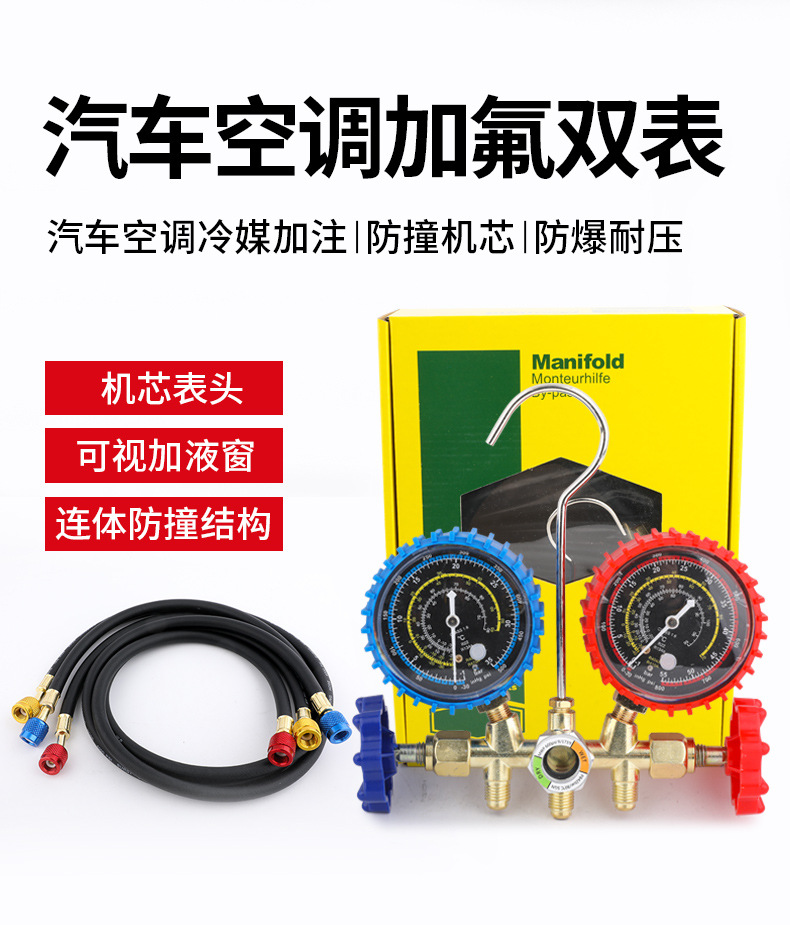 - What You Get: One professional automotive AC refrigerant manifold gauge set with dual gauges, integrated anti-collision core, visible liquid window, and corresponding charge hoses. Offers essential tools for effective AC maintenance.