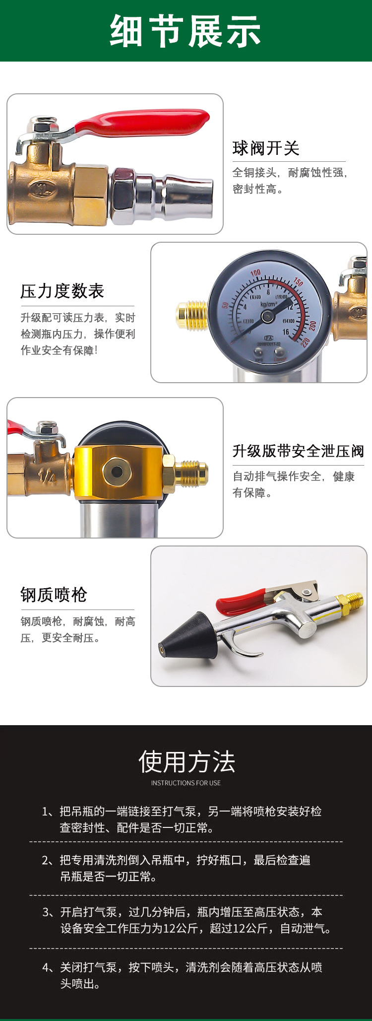 - Key Specs & Performance: Features a pressure release valve for safe operation and a precise pressure gauge (Do not exceed 0.8Mpa) for optimal flushing performance, enhancing cooling efficiency.