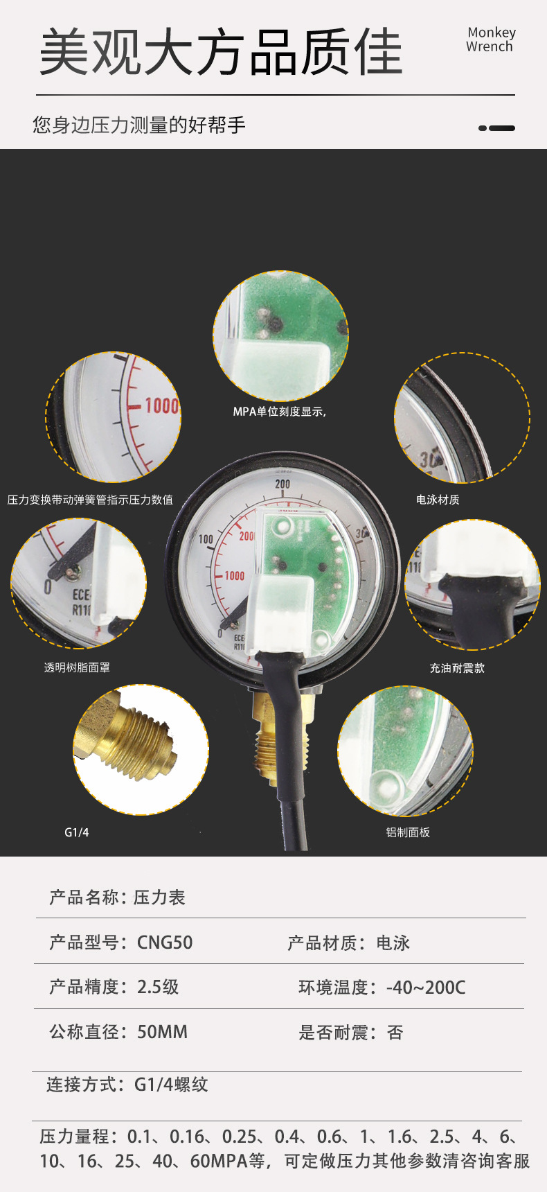 - Quality & Durability: Features a robust 50mm diameter display with clear markings (0-40 MPa/0-300 Bar/0-2000 PSI) for reliable long-term performance.