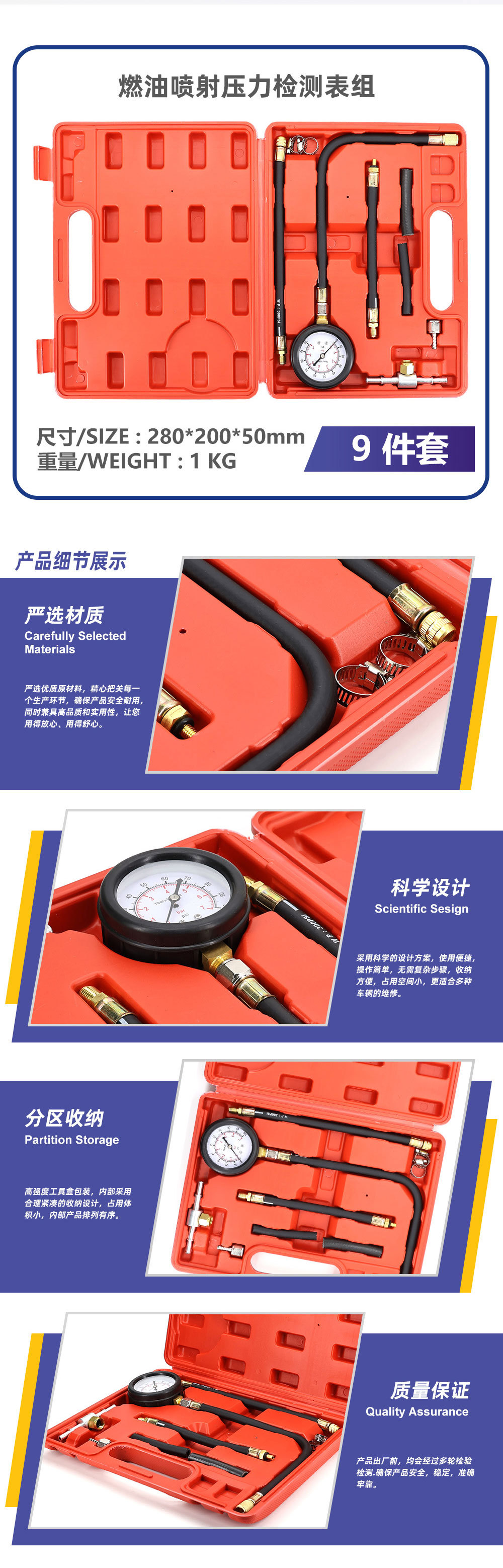- Wide Compatibility: This 9-piece fuel pressure test kit is universally designed for automotive and motorcycle fuel injection systems, ensuring broad applicability for various vehicle makes and models.