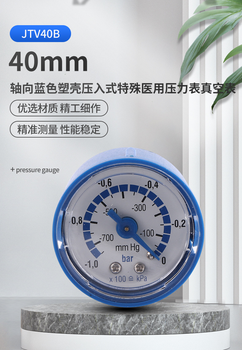 Auxiliary Suction Pressure Gauge JTV40B 40mm Axial Blue Plastic Case for Medical Vacuum Systems Replaces JTV40B