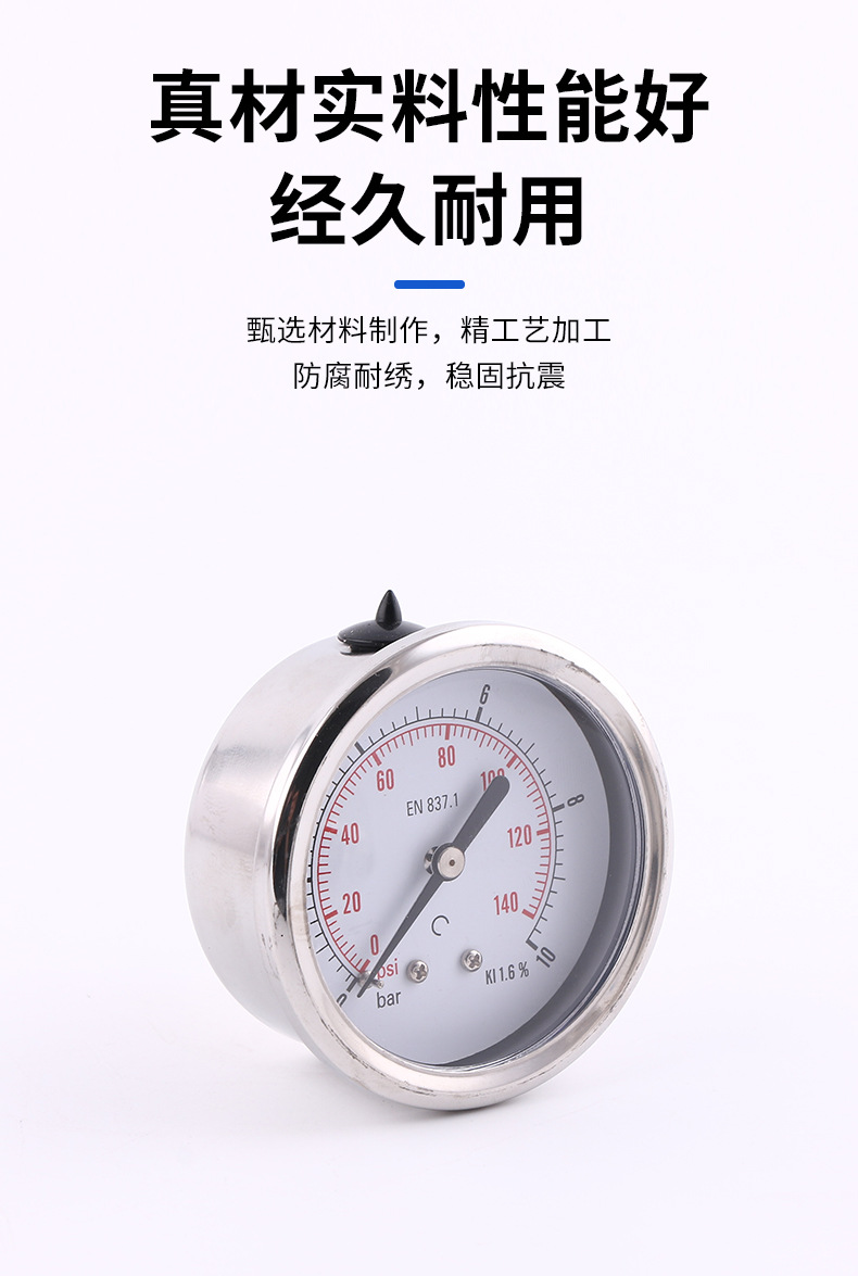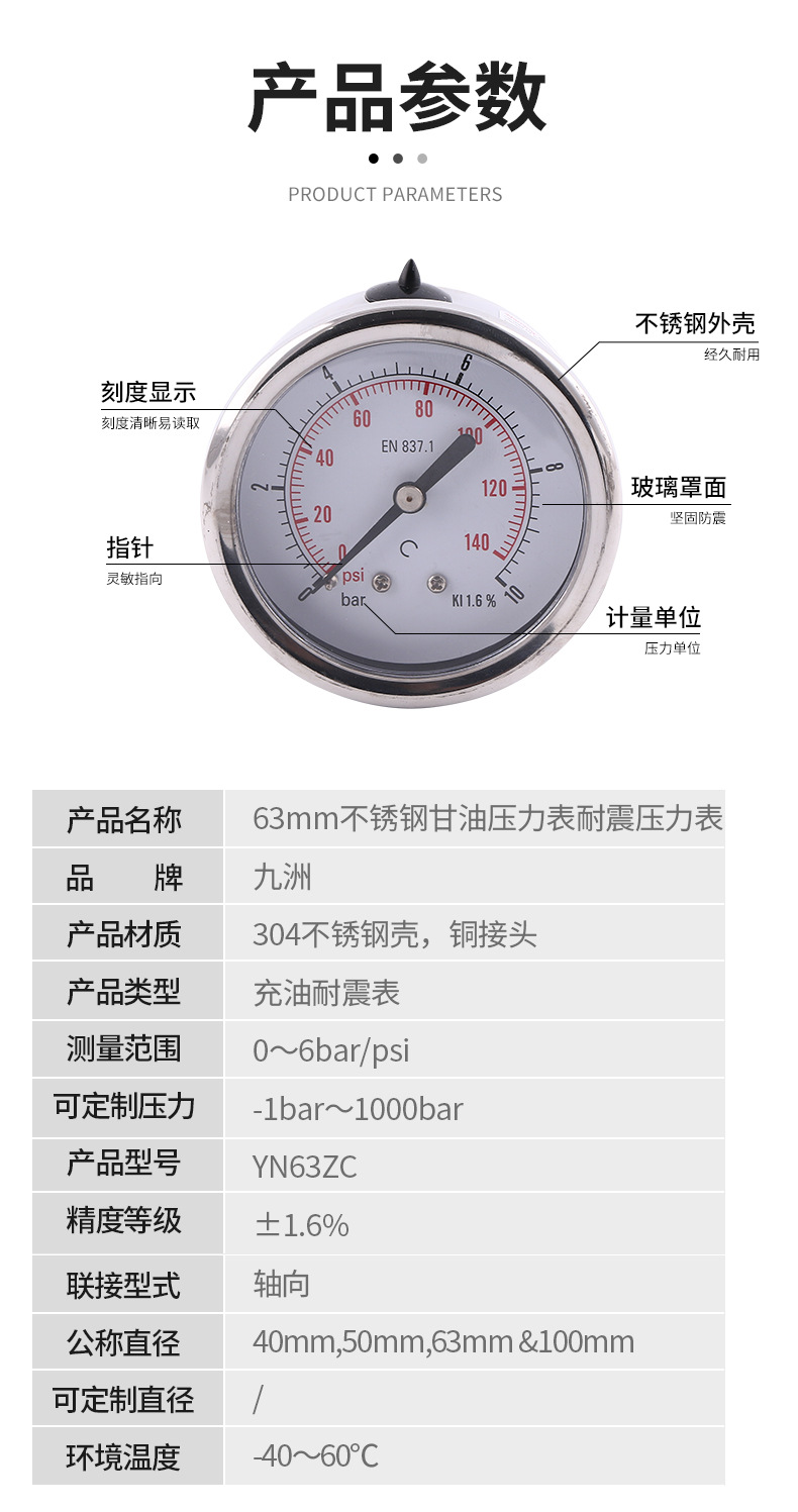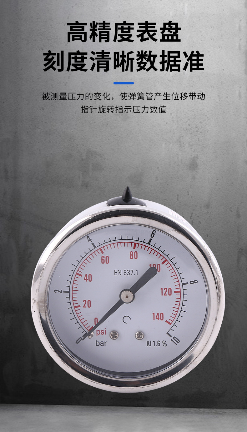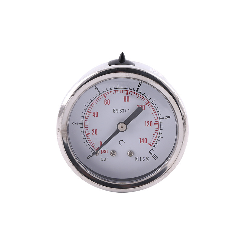- Key Specs & Performance: This 63mm axial glycerin-filled pressure gauge provides accurate readings from 0-10 bar/psi with a precision class of ±1.6% (KI 1.6%) as per EN 837.1 standards, offering stable performance even in vibrating environments.