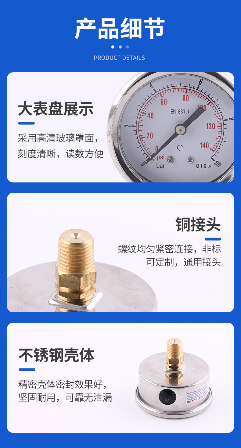 - Easy Installation: Equipped with an axial connection type, making it straightforward to install in compatible systems. The oil-filled design ensures smooth pointer movement and extends the gauge’s lifespan.