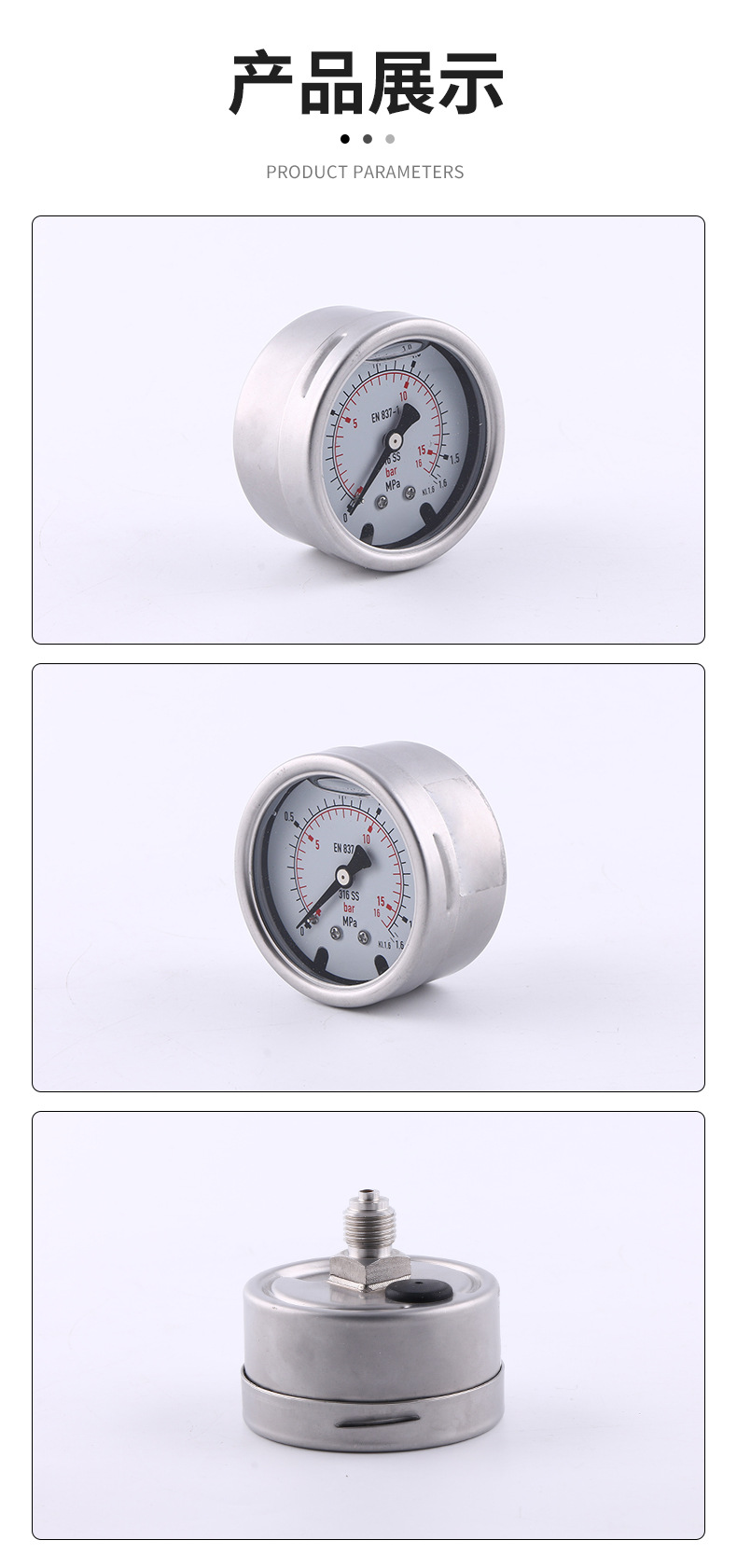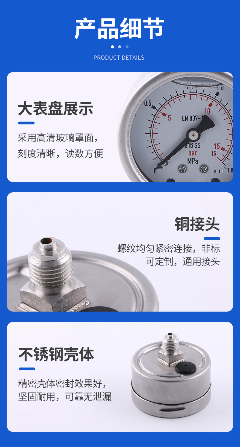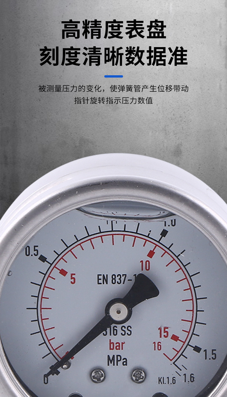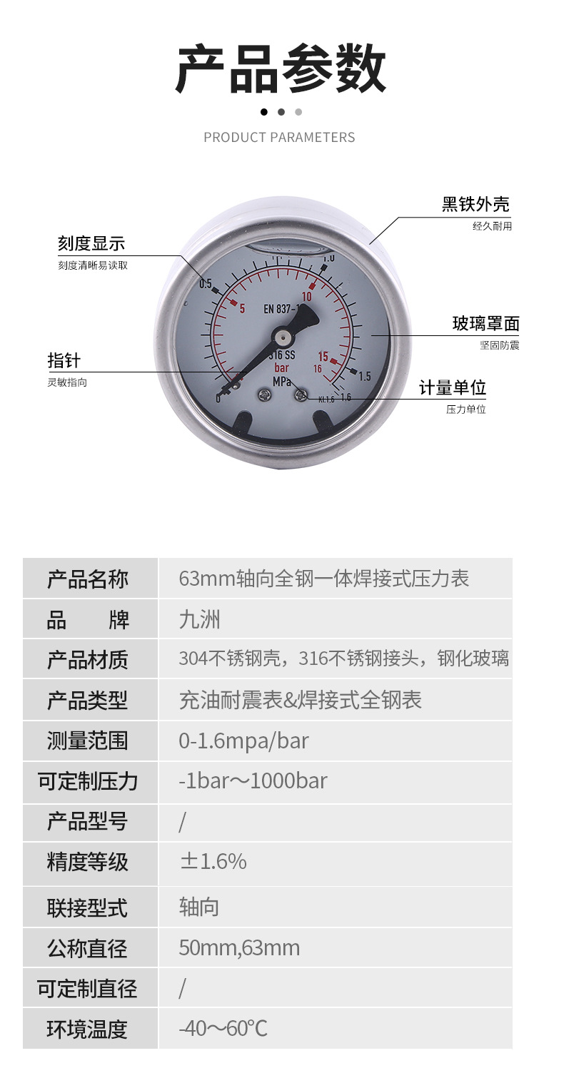 - Key Specifications: Features a 63mm nominal diameter and measures pressure from 0 to 1.6MPa (0-16bar). Built to EN 837-1 standards with KL.1.6 accuracy for reliable performance.