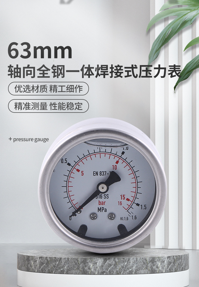 Axial All-Steel Welded Pressure Gauge 63mm (2.48in) Diameter with 316 SS Case, 0-1.6MPa (0-16bar) Range, EN 837-1 Compliant, KL.1.6 Accuracy for HVAC Systems