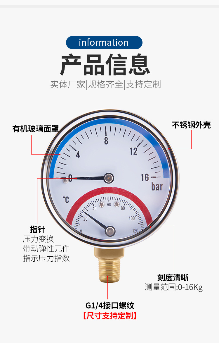 - Key Specifications: Features a dual-display with a pressure range of 0-16 bar and temperature range of 0-120°C, providing comprehensive monitoring for various systems.