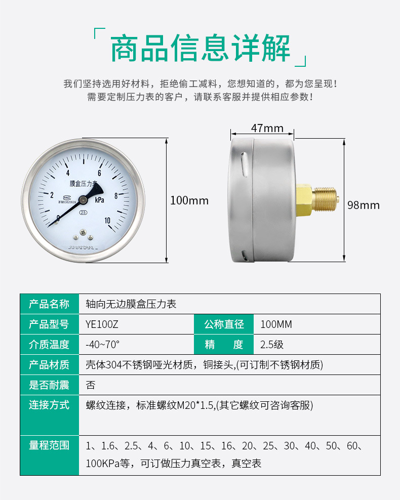 - What You Get: One KAIXUAN axial diaphragm pressure gauge YE100Z, offering reliable pressure monitoring and backed by a one-year warranty.