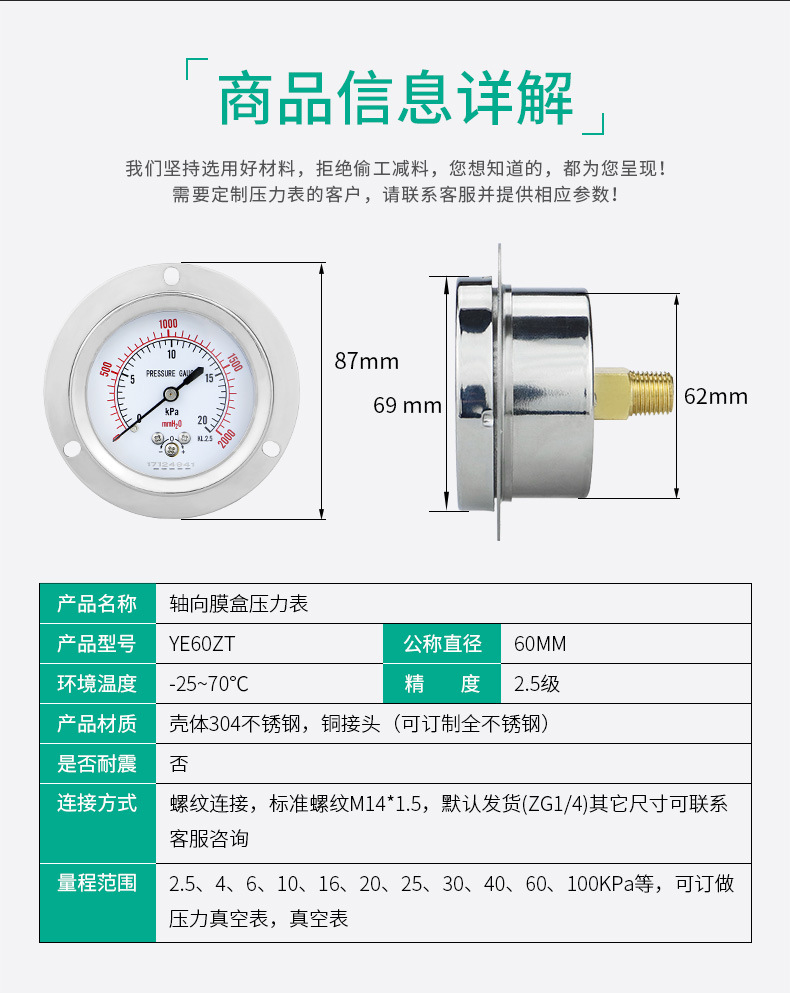 Be the first to review “Axial Diaphragm Pressure Gauge YE60ZT Stainless Steel Micro Pressure Gauge for Gas Panel Mount (0-2.5KPa)” Cancel reply