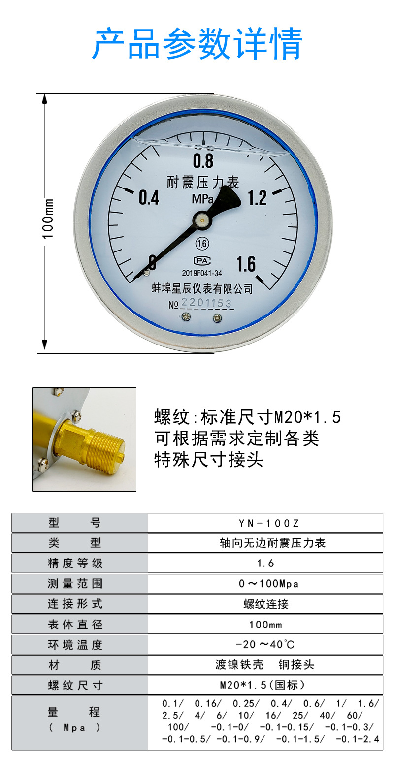Axial Oil-Filled Pressure Gauge YN-100Z Series for Water, Air, Oil, Liquid Pressure Systems 0-1.6MPa
