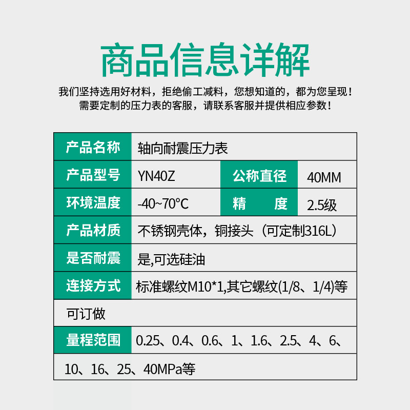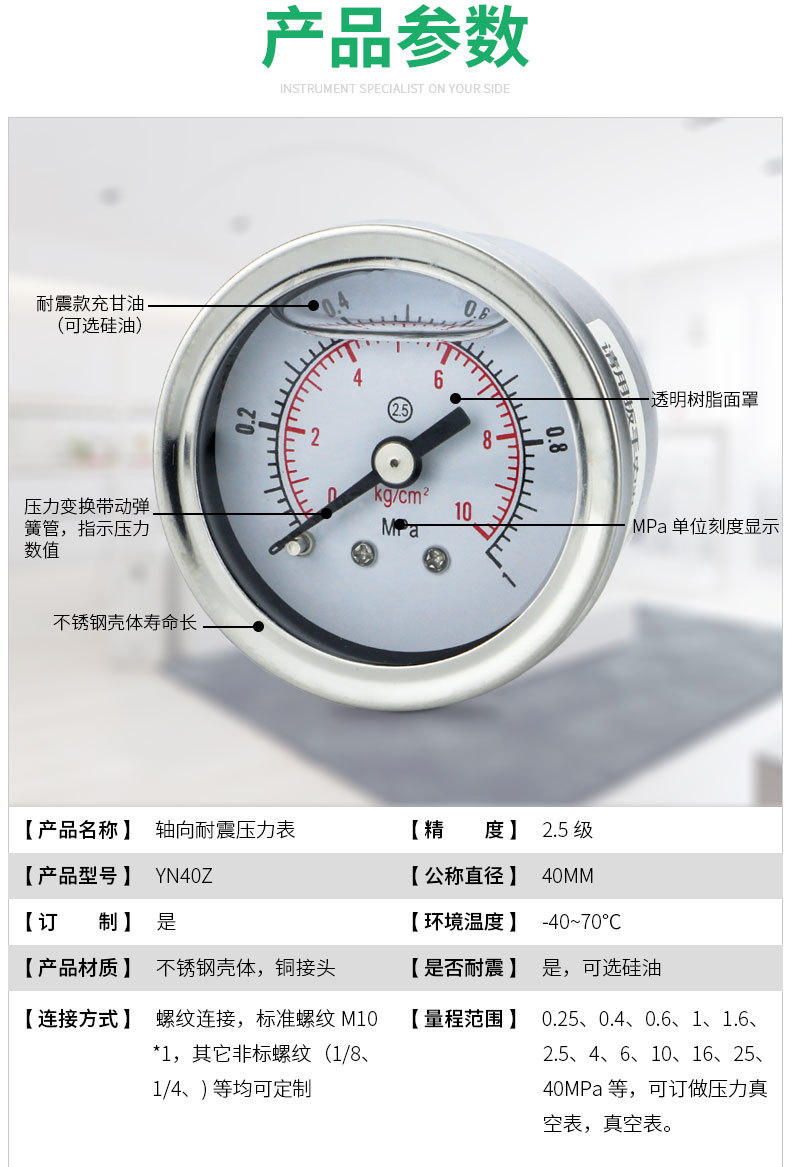 - What You Get: One YN40Z Axial Seismic Pressure Gauge, ready for immediate installation. Customizable nominal diameter and resistance to -40~70°C ambient temperatures ensure adaptable and secure functionality.