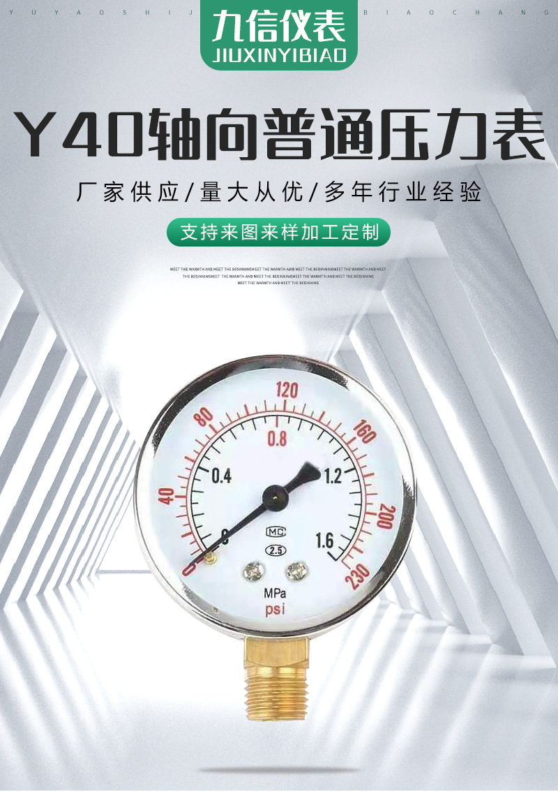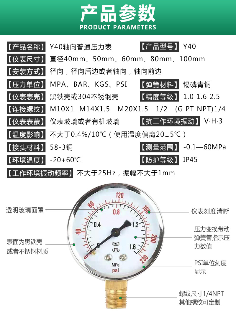 Axial Pressure Gauge (Y40, -0.1-60MPa/psi, 1.0/1.6/2.5 Accuracy) for Air Compressor Equipment, Replaces Y40 Axial Thread General Pressure Gauge