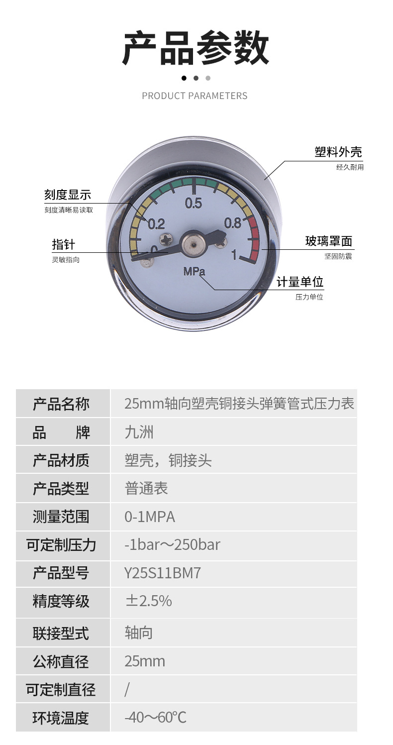 - Key Specifications: Features a 25mm nominal diameter with an axial connection type and a measuring range of 0-1 MPa, ensuring precise pressure readings for various applications.
