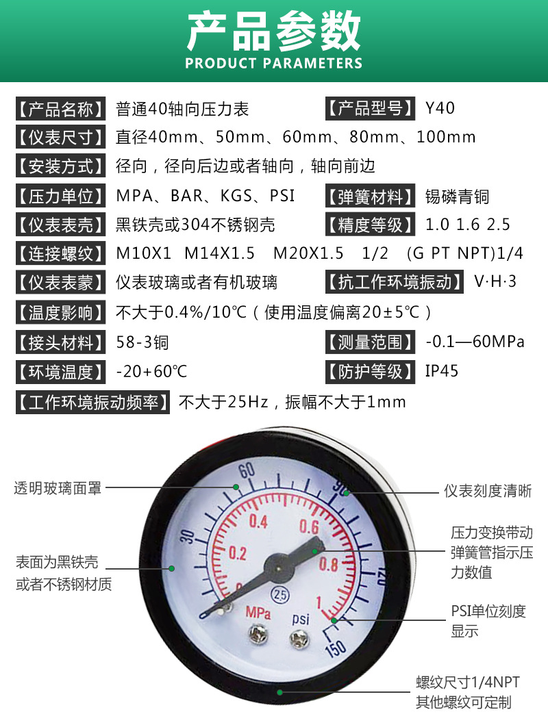 - Versatile Compatibility: Designed for measuring pressure in various media including oil, air, liquid, and water, with a wide range of -0.1 to 60 Mpa/psi.