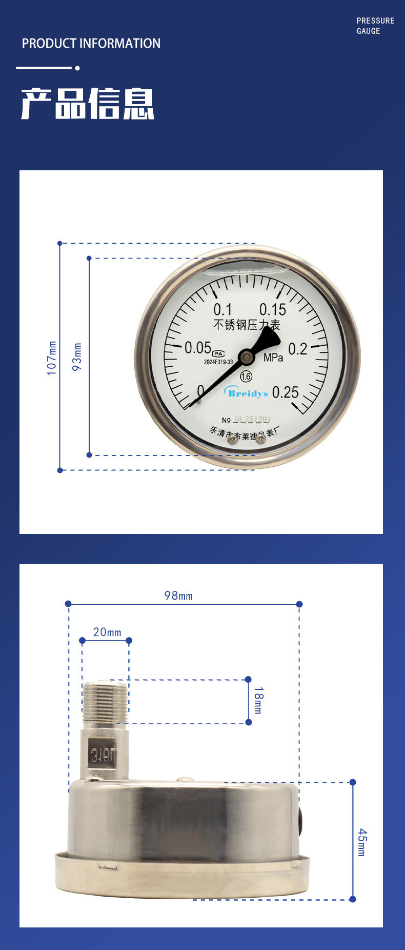 - What You Get: One Breidys YNBF100Z high-precision stainless steel pressure gauge, providing an essential component for system monitoring and ensuring operational safety and efficiency.