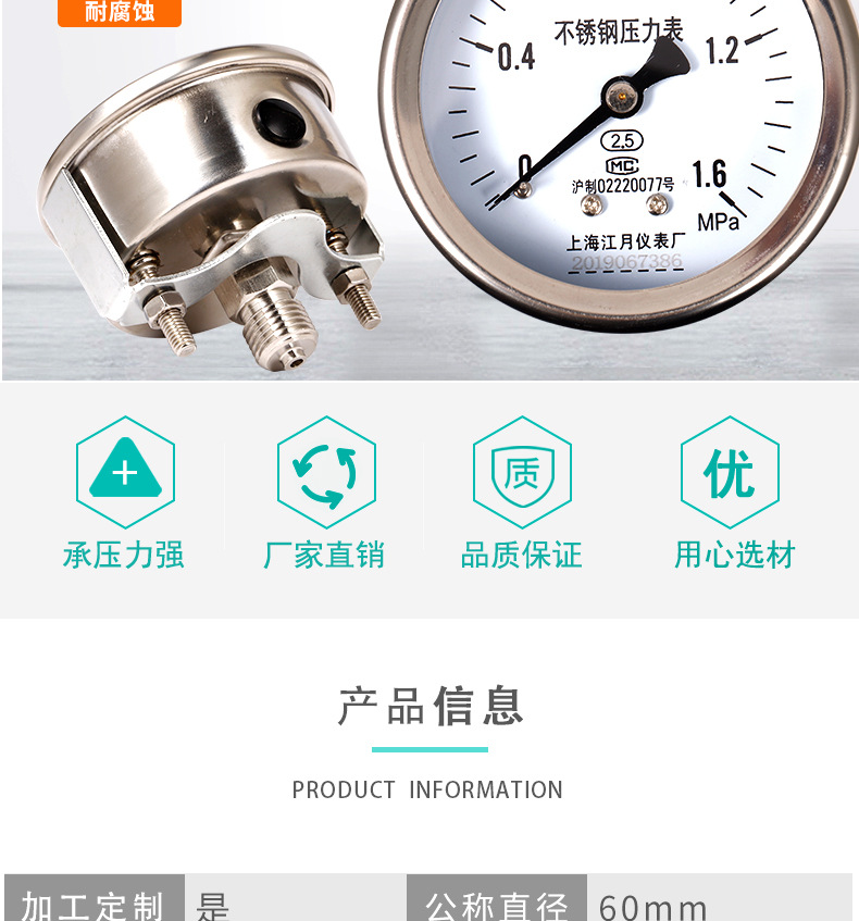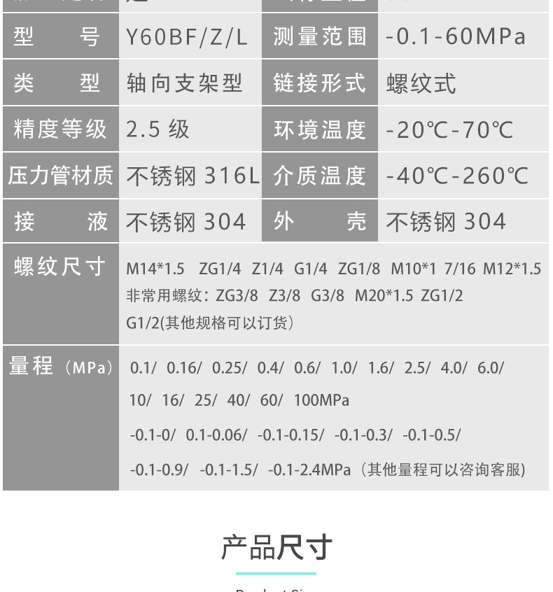 Axial Stainless Steel Pressure Gauge Y-60BF/Z/T (0-1.6 MPa) for Industrial Oil Hydraulic Systems