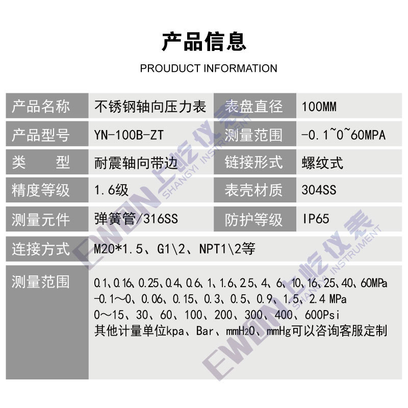 - What You Get: Includes one EWON YN-100B-ZT Axial Stainless Steel Pressure Gauge, manufactured in Shanghai, providing accurate readings and stable operation. (Note: Not an imported item).