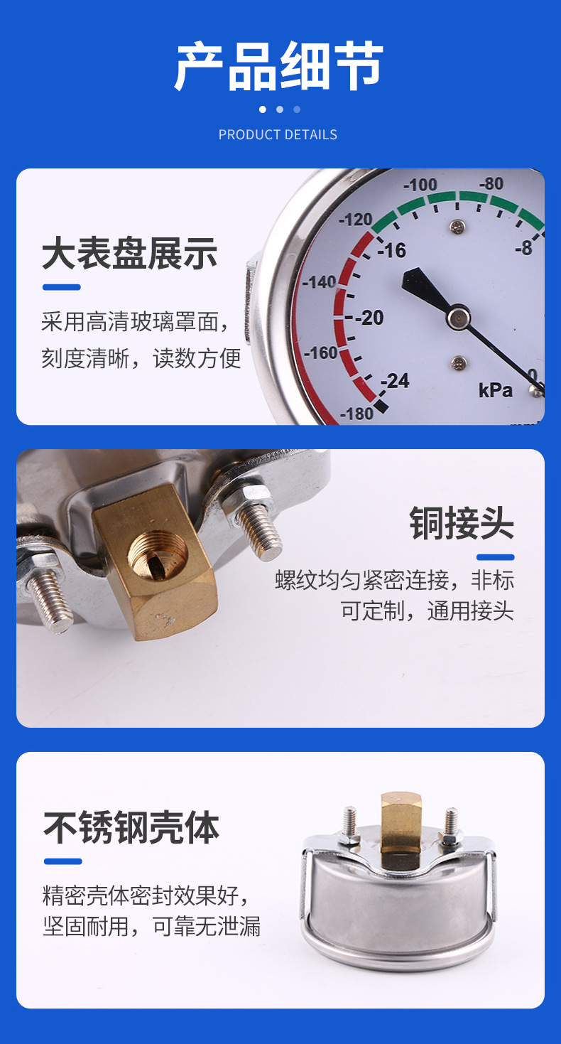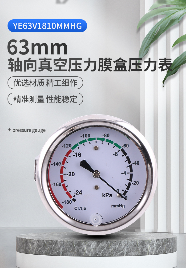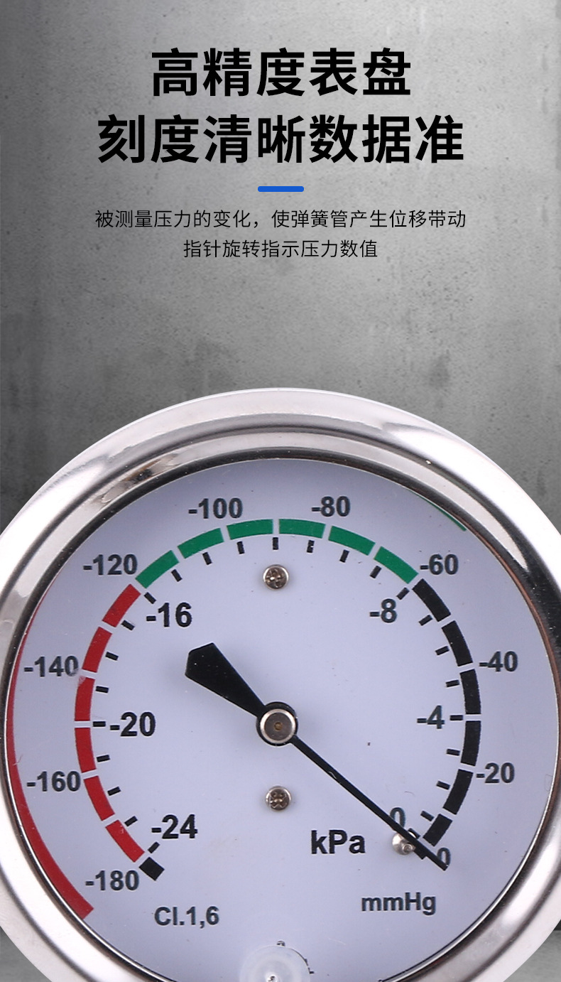 - Key Specs & Performance: Features a precise -180mmHg to 0 measurement range with an accuracy class of CI.1,6 (±1.6%), providing accurate and easy-to-read pressure indications.