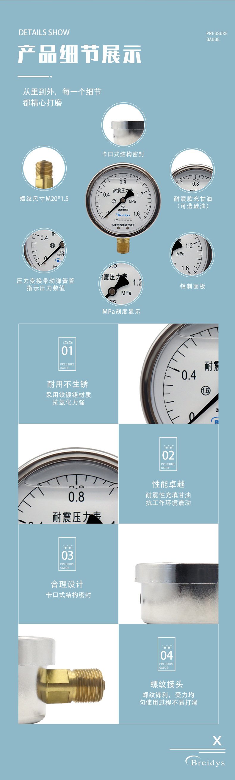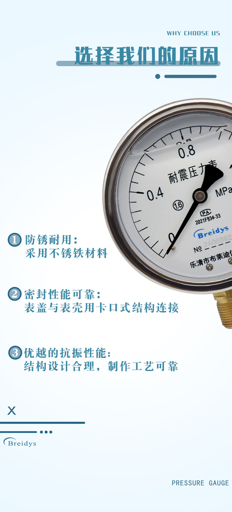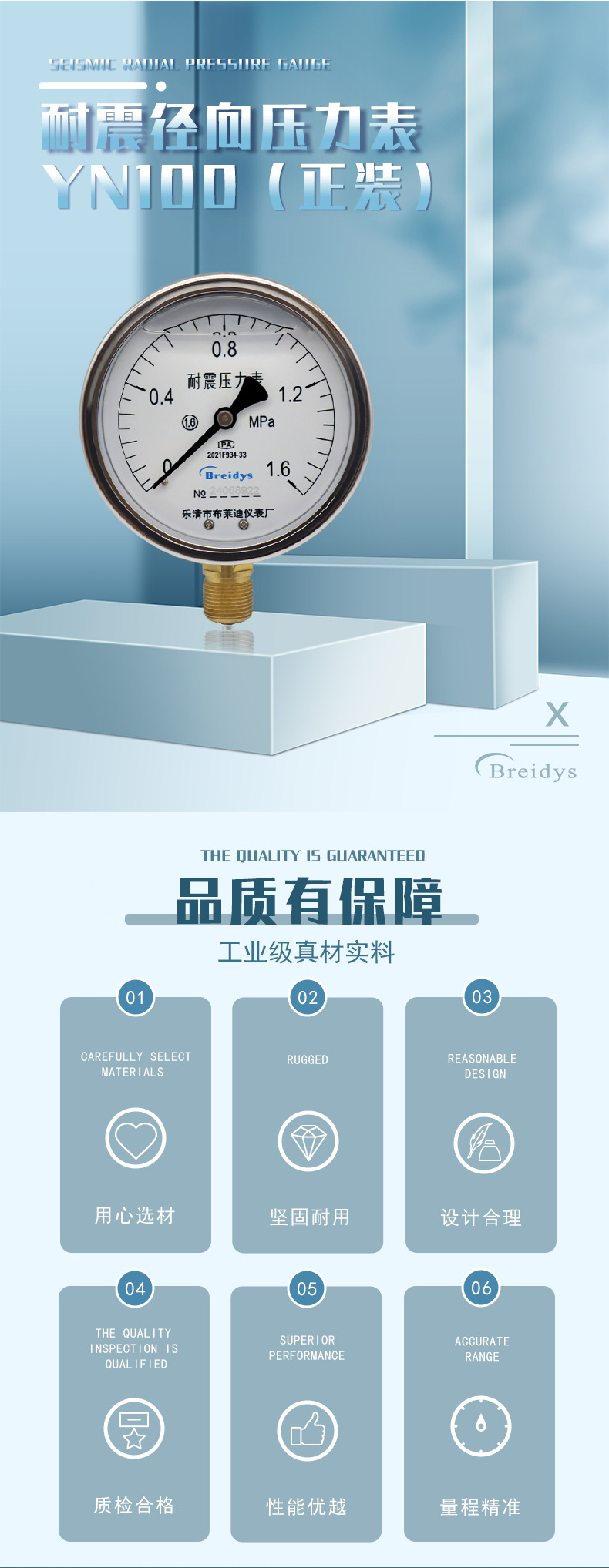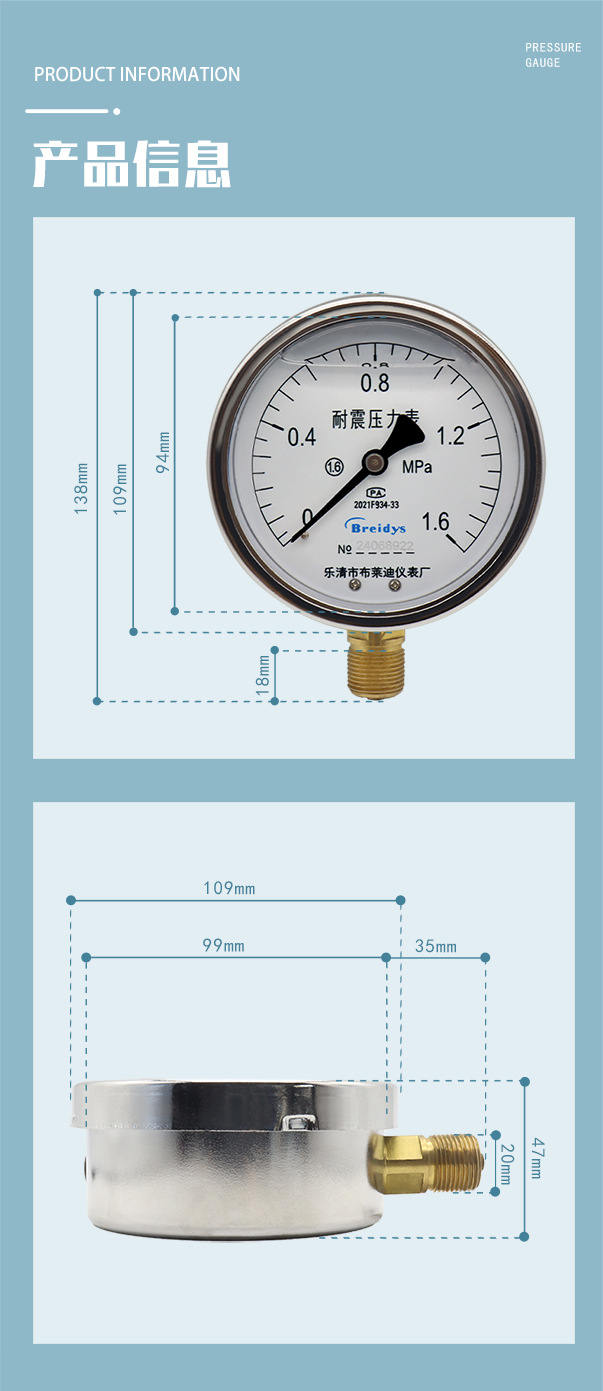 - What You Get: One Breidys YN100 shock-resistant pressure gauge. This product is factory direct, offering quality assurance and support for customization to meet specific project requirements.
