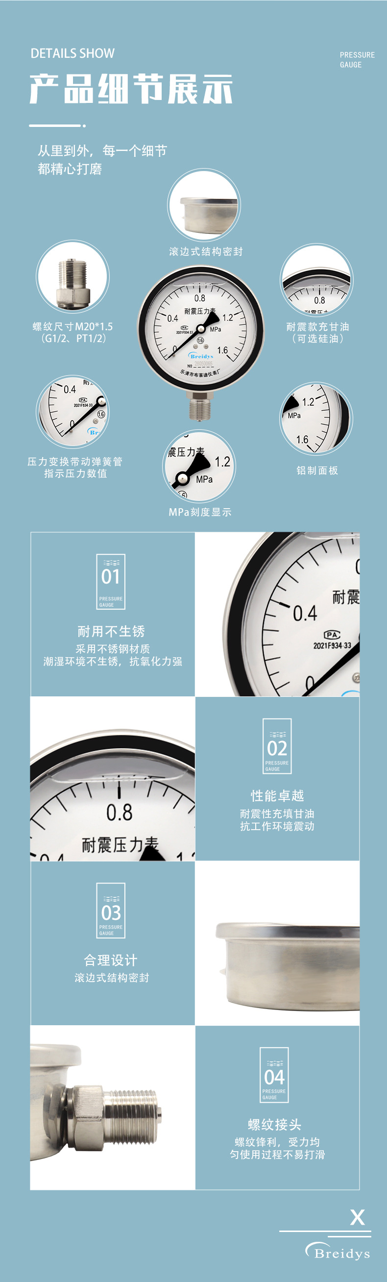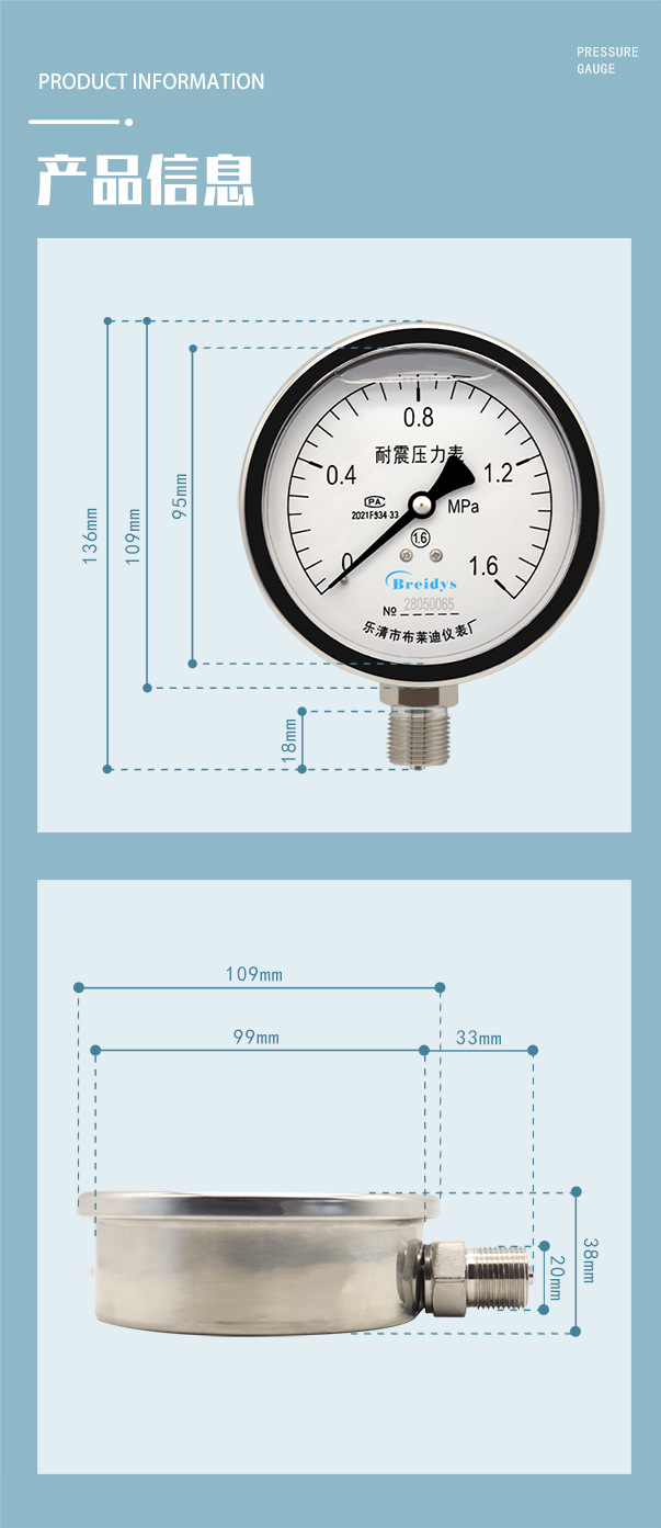 - Wide Compatibility: Breidys YN100 pressure gauge is designed for versatile use in a wide range of applications including water pressure, oil pressure, hydraulic systems, and gas pressure measurement.