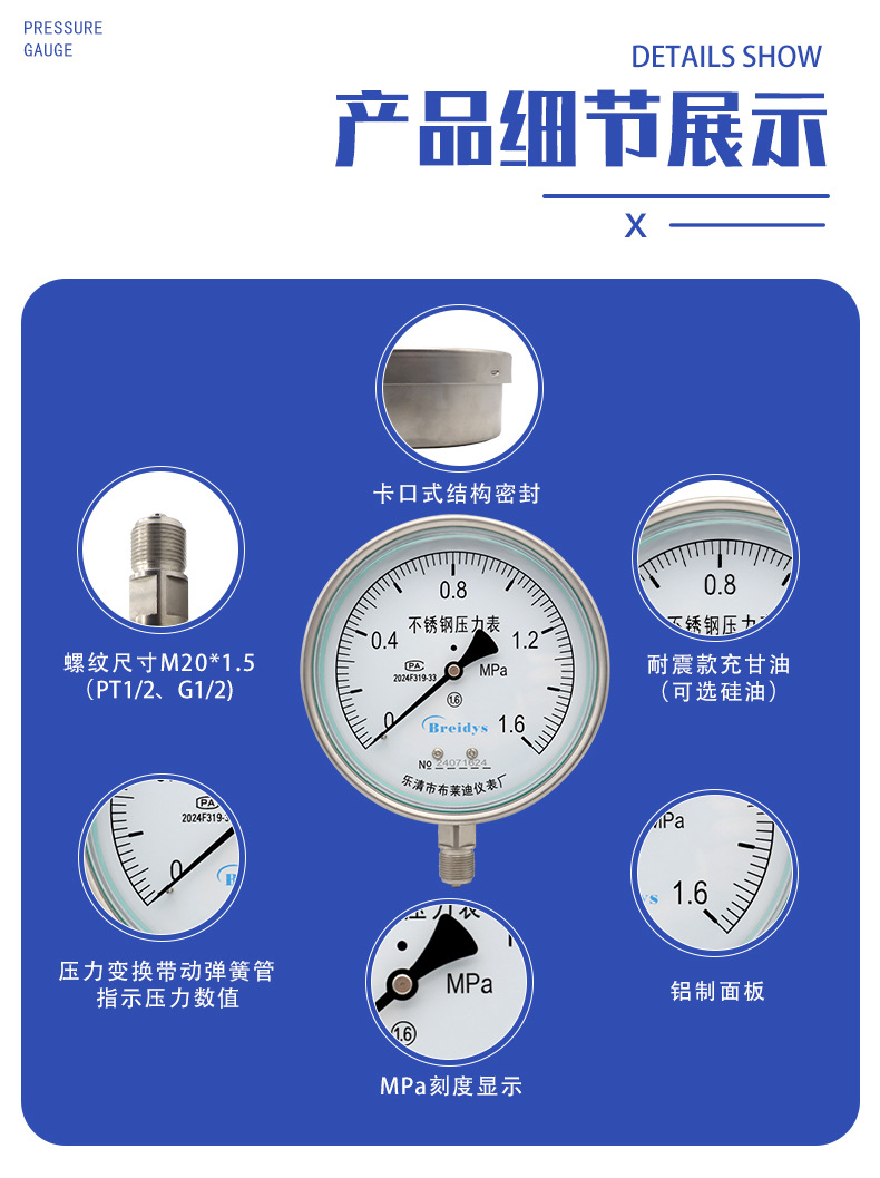 Breidys YNBF150 Stainless Steel Pressure Gauge (0-1.6MPa, 150mm, 1.6 Accuracy) for Air Water Hydraulic Systems, Replaces 24071624