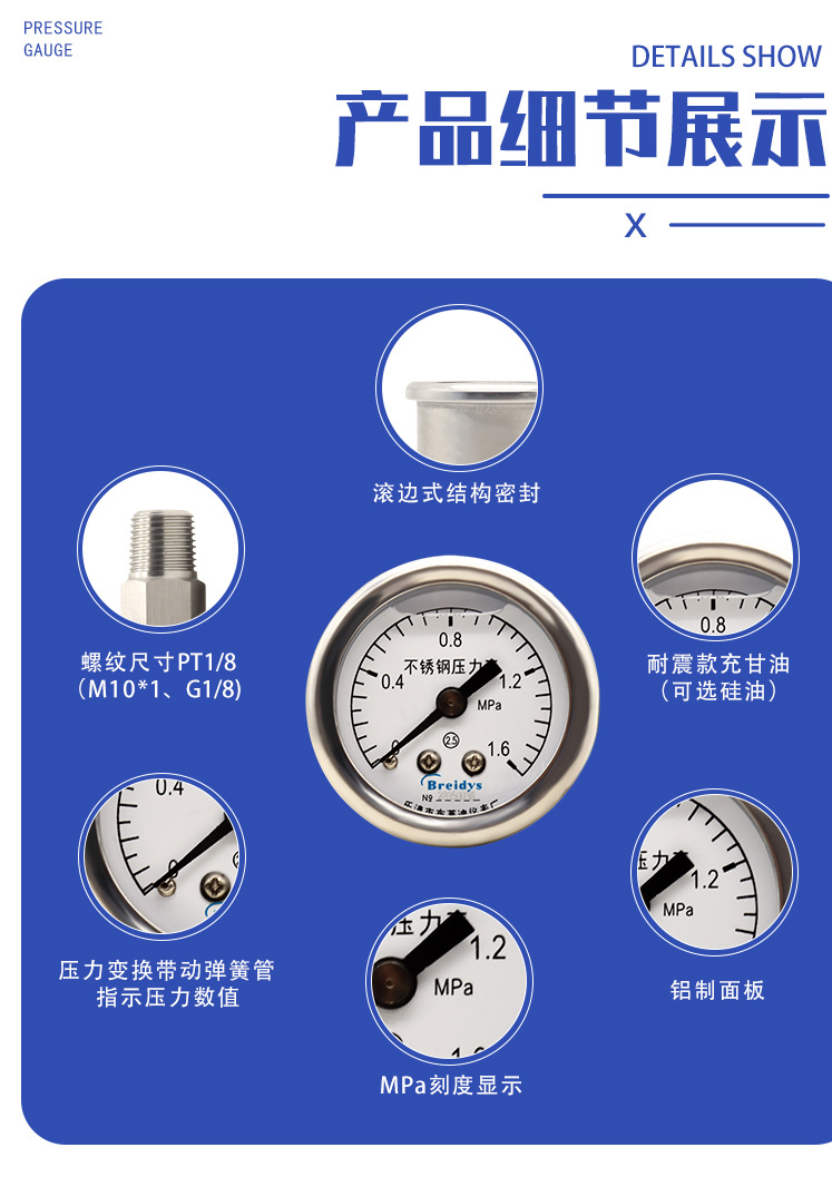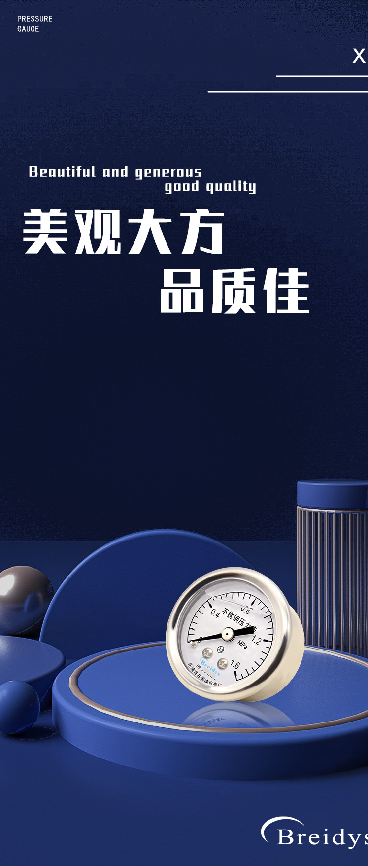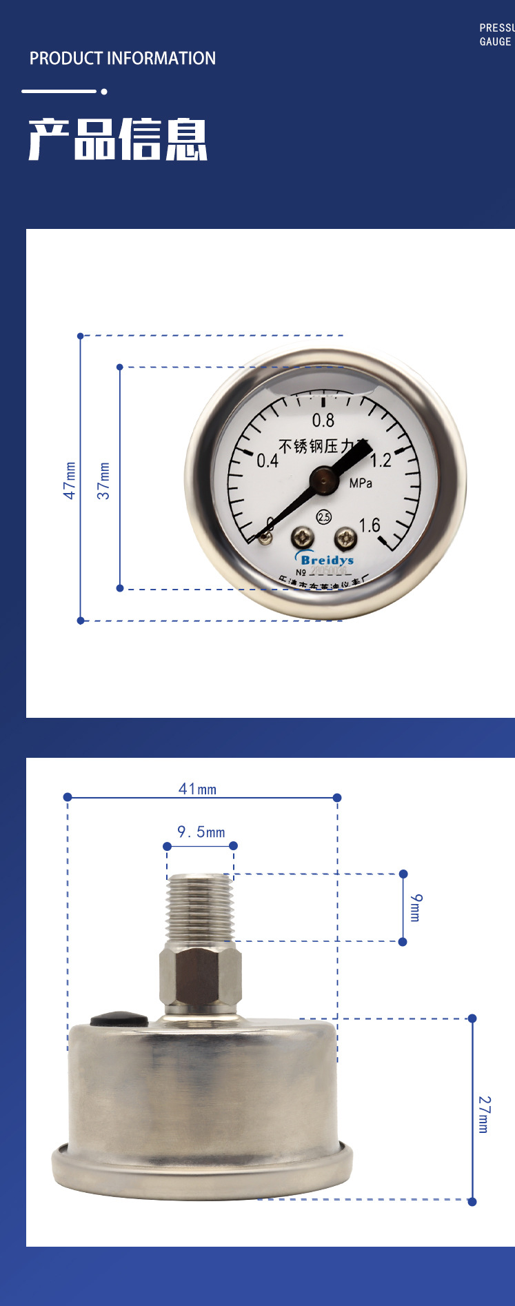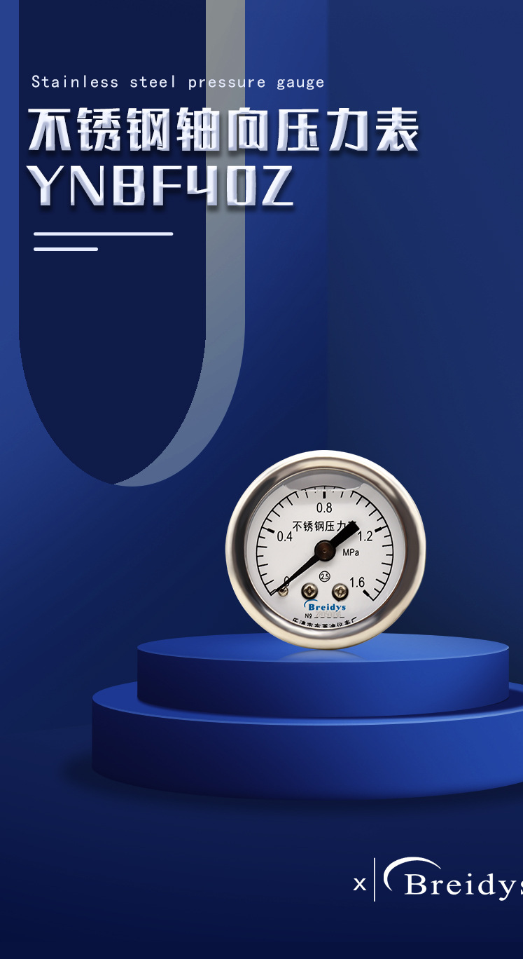 Breidys YNBF40Z Axial Stainless Steel Pressure Gauge (0-1.6MPa, 40mm, High Precision 2.5) for Hydraulic Pneumatic Water Systems