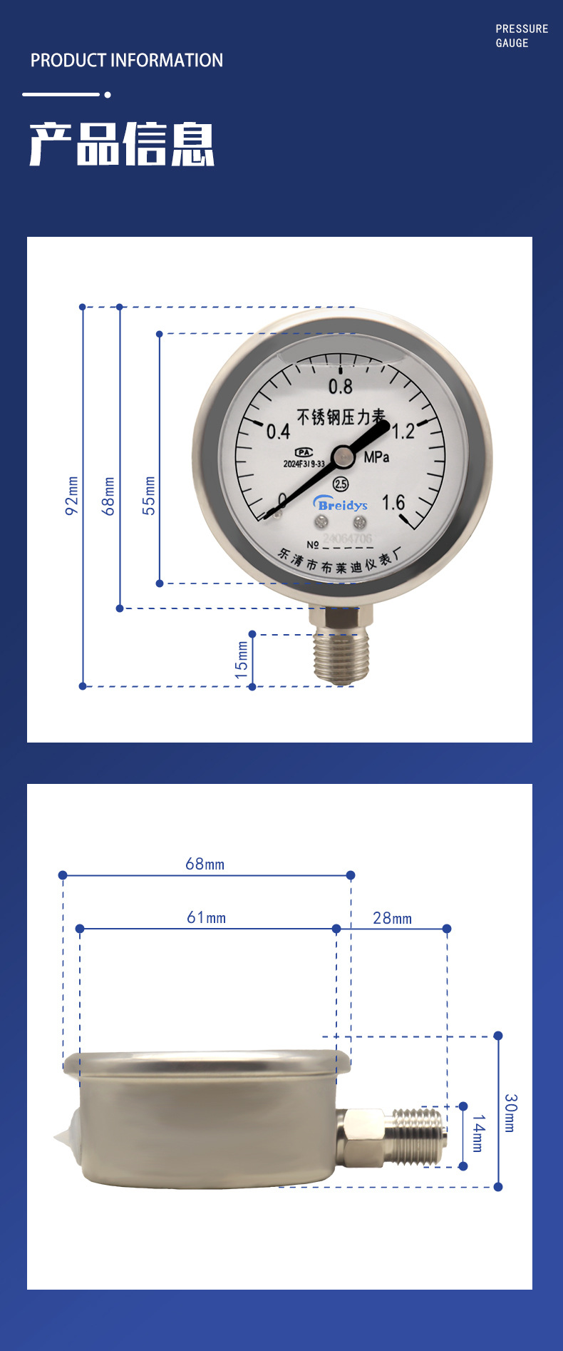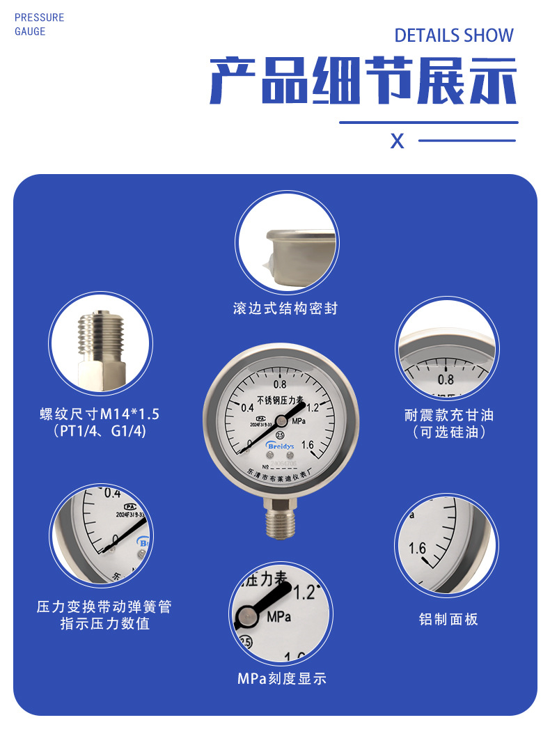 Breidys YNBF60 Stainless Steel Pressure Gauge (0-1.6 MPa, M14*1.5 Thread) for HVAC Hydraulic Pneumatic Water Systems, Replaces YNBF60