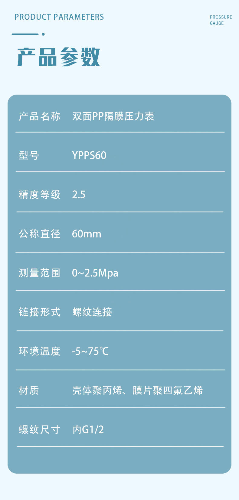 Breidys YPPS60 PP Diaphragm Pressure Gauge (0-25KG, 60mm Diameter) for Water Treatment Acid & Alkali Resistance