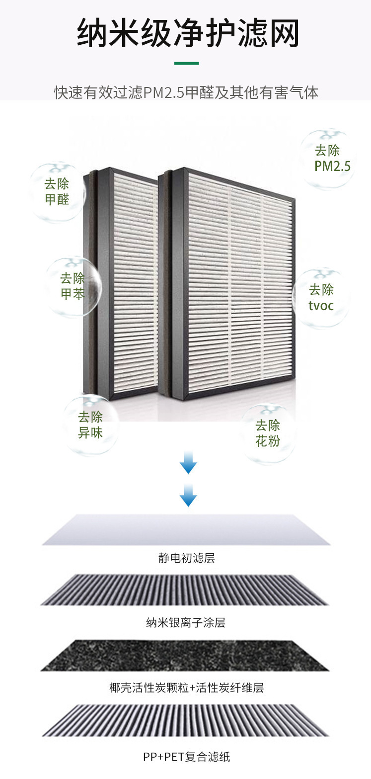 - Key Specs & Performance: Effectively filters dust, pollen, 0.3 micron particulate matter, allergens, pet dander, removes odors, and formaldehyde.