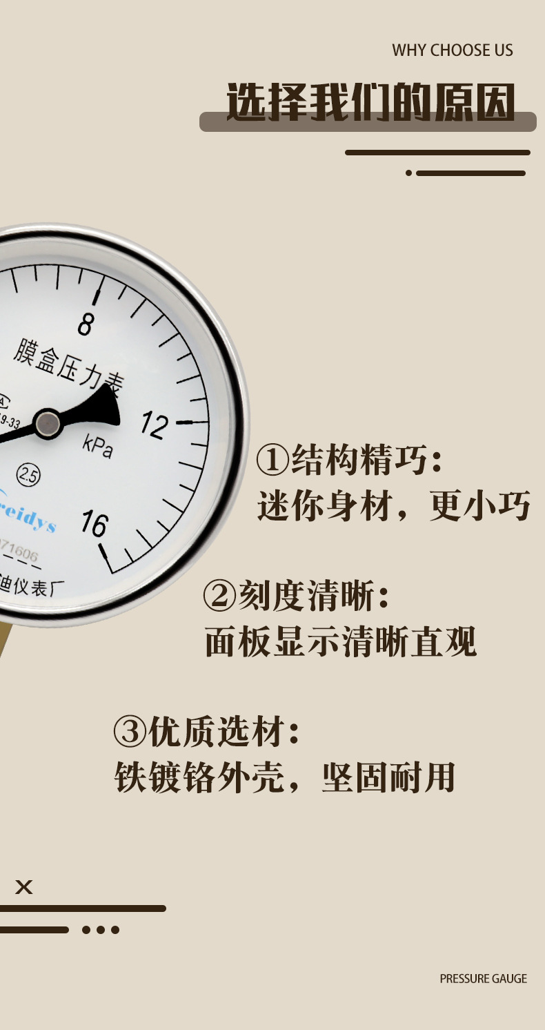 - Wide Compatibility: Precision diaphragm pressure gauge compatible with various industrial applications requiring micro-pressure measurement, suitable for gas lines and HVAC systems.