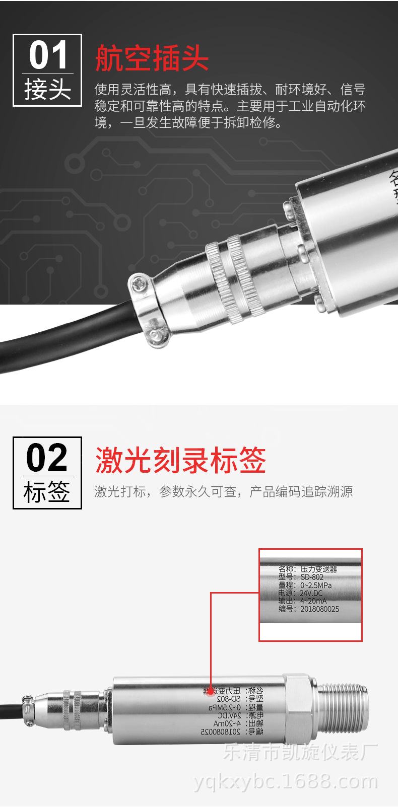 Diffused Silicon Pressure Transmitter (0-2.5MPa 4-20mA 24VDC, Model SD-802, Aviation Plug) for Water, Air, Oil Pressure Systems