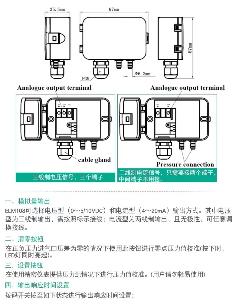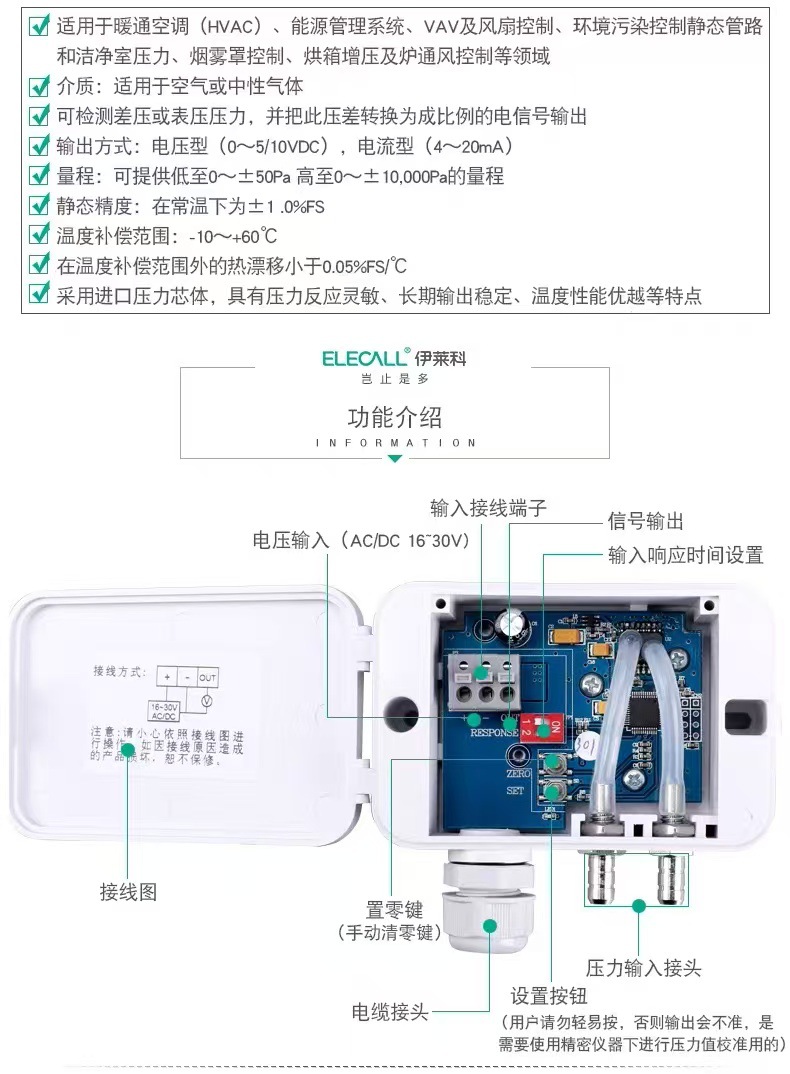 - Wide Compatibility: ELECALL micro differential pressure sensor transmitters are compatible with various HVAC systems, offering 4-20mA or 0-10V output options to suit diverse applications and ensure seamless integration.