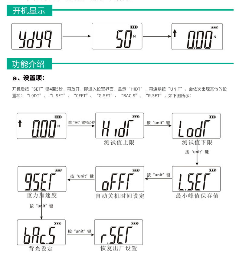 - Easy Operation: Intuitive design with clearly labeled buttons (UNIT, ZERO, SET, OFF/ON) for simple and efficient operation, allowing quick setting adjustments and data readings.