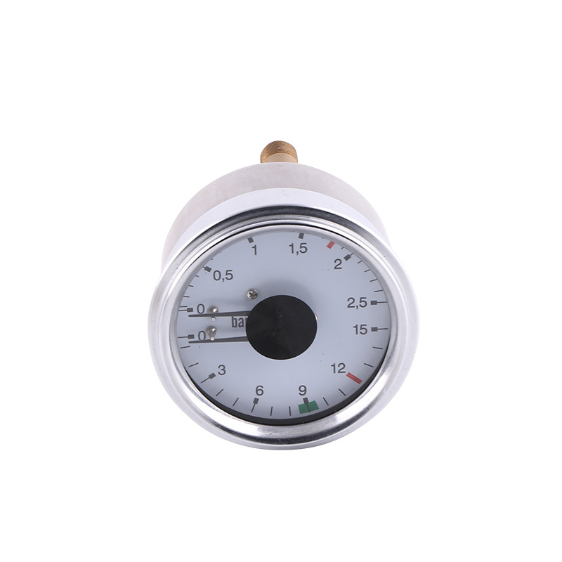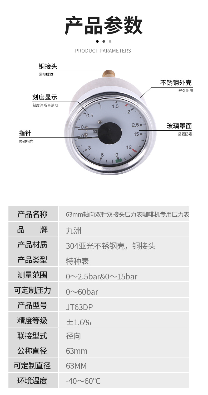 Durable Stainless Steel Axial Pressure Gauge (63mm, Dual Needle, Dual Joint, 0-2.5bar & 0-15bar) for Coffee Machines, Replaces JT63DP