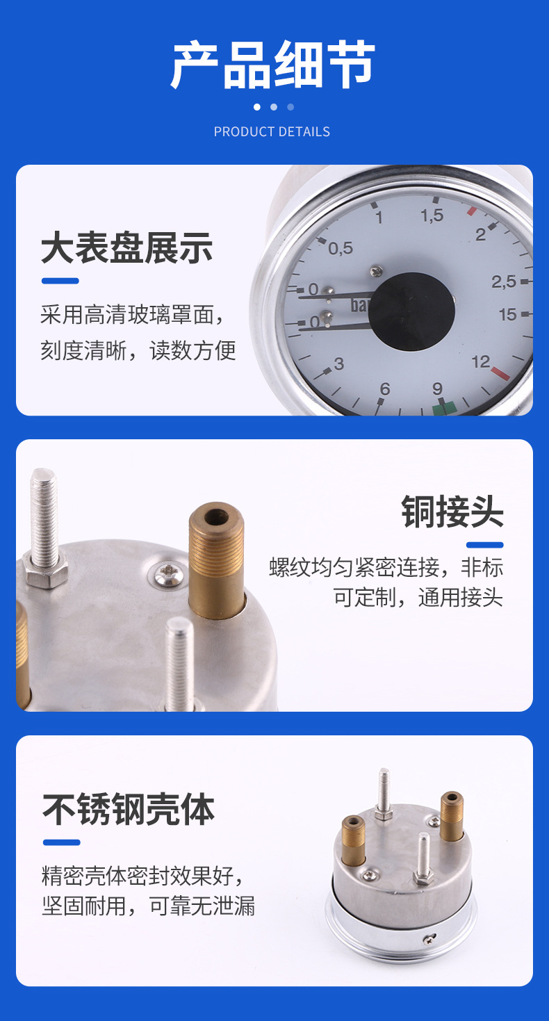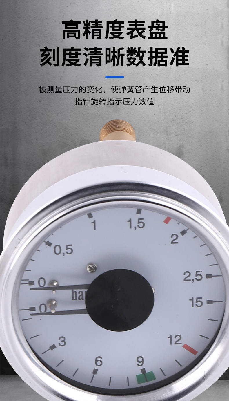 - Accurate & Clear Readings: Features a 63mm dial with dual needles and dual joints, providing two measurement ranges (0-2.5bar and 0-15bar) for comprehensive and accurate pressure monitoring with ±1.6% precision.