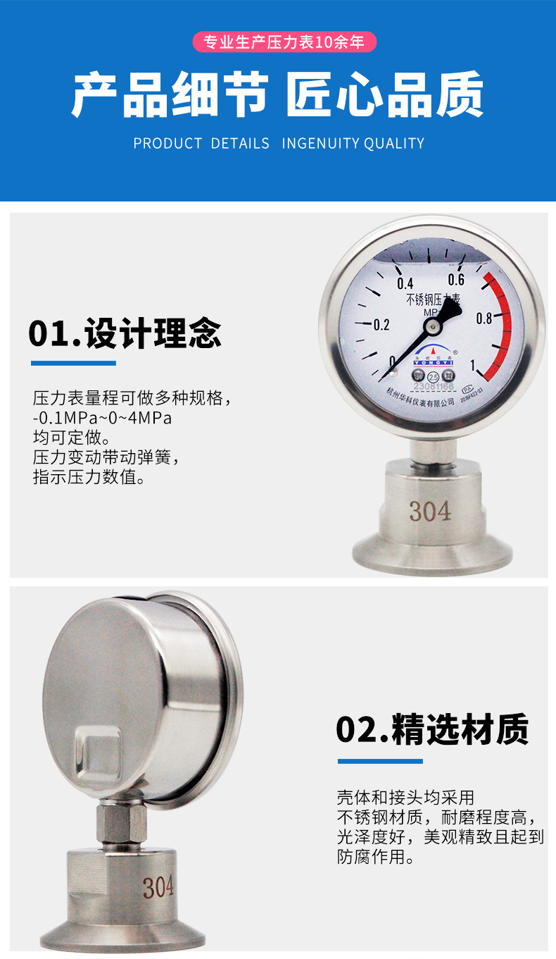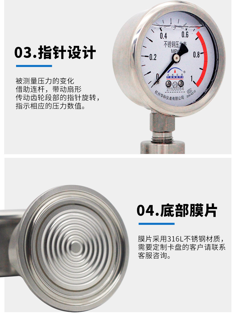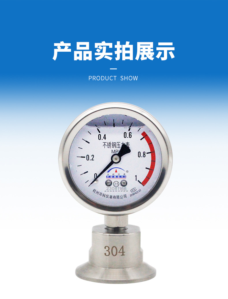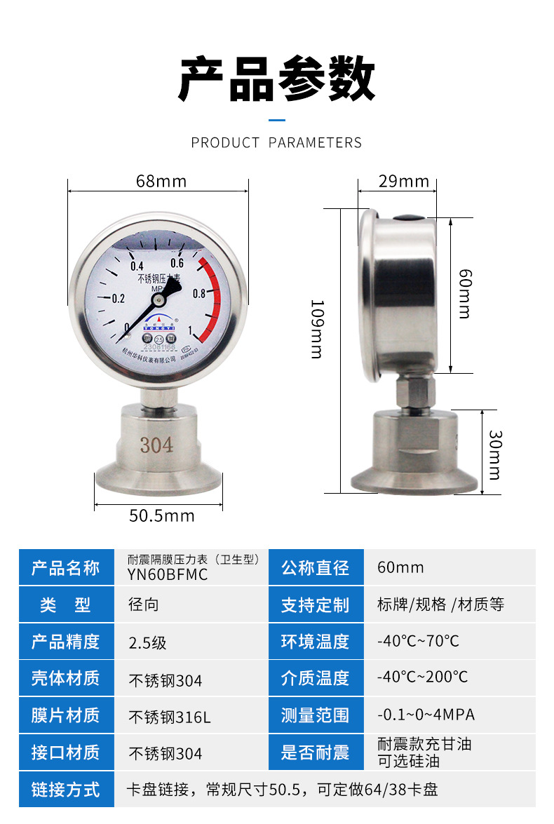 Durable Stainless Steel Diaphragm Pressure Gauge YN60BFMC (Diaphragm Pressure Meter) with Sanitary Type Quick-Clamp Fitting DN50.5mm, 304 Stainless Steel for Water, Liquid, Oil & Gas Systems