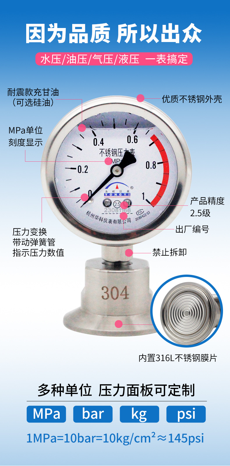 - Premium Quality & Durability: Constructed from high-grade 304 stainless steel, ensuring exceptional corrosion resistance and a shock-resistant diaphragm for long-lasting performance in demanding industrial environments.