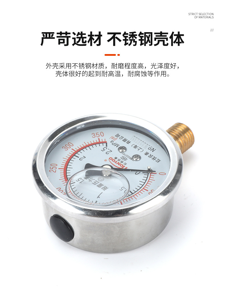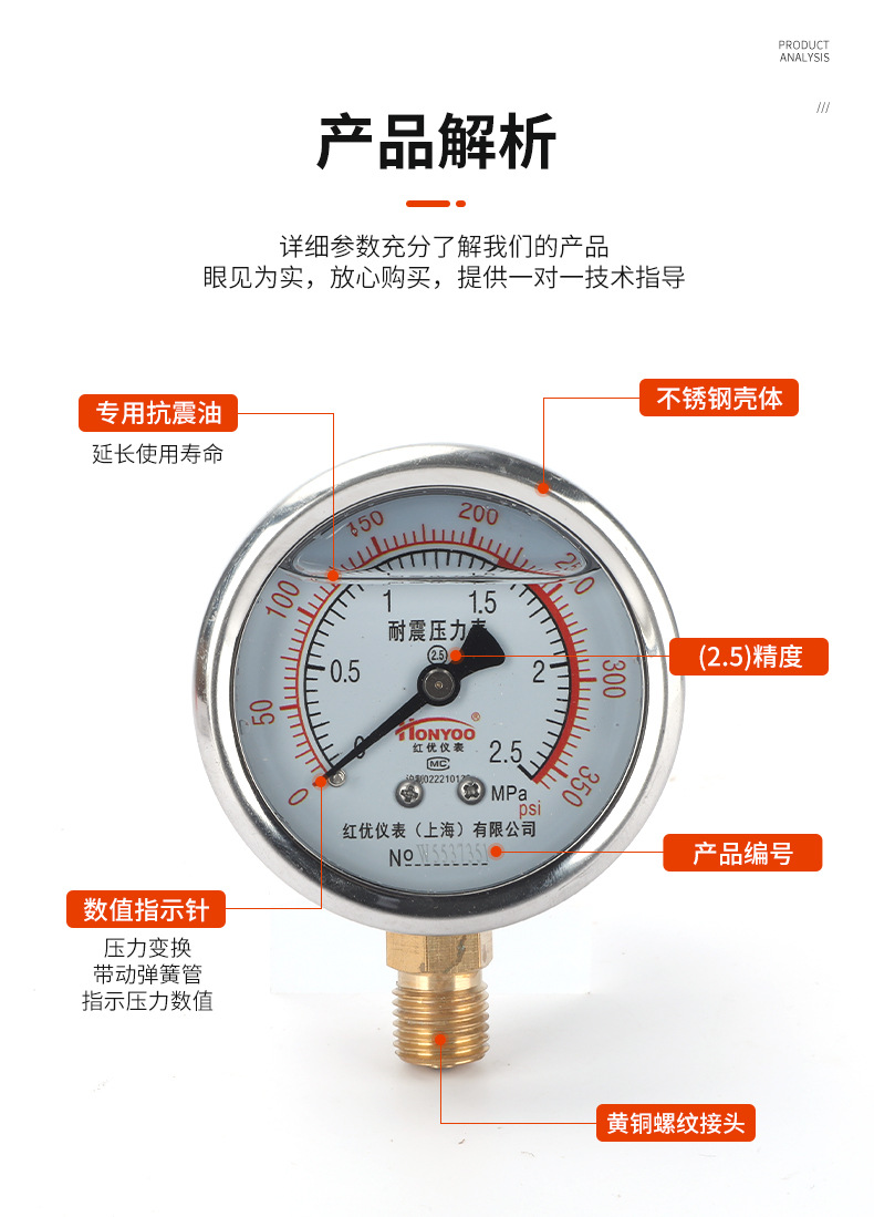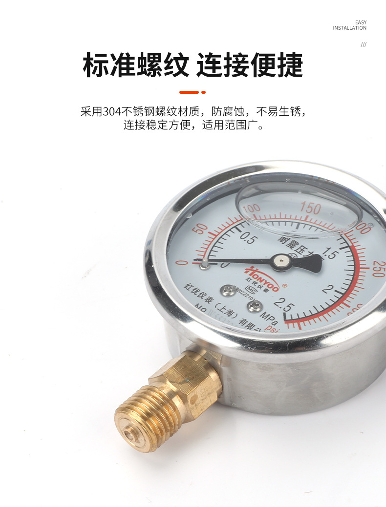 - Wide Compatibility: YN60 pressure gauge with various ranges (0-2.5MPa shown) suitable for air compressors, hydraulic systems, and water/oil pressure boosting pumps.