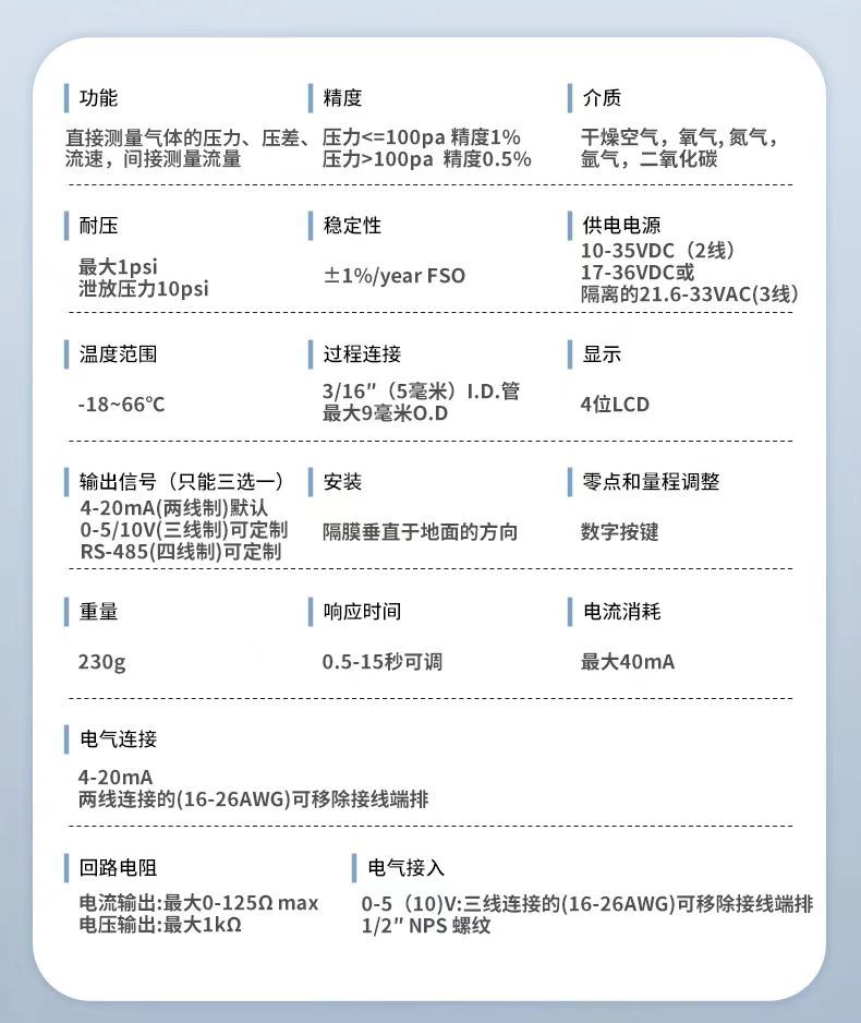 - Key Specs & Performance: Offers high precision with ±0.5% accuracy, multiple output signals (4-20mA, 0-10V), and optional RS485 communication, capable of measuring pressure, differential pressure, and flow rate for gases.