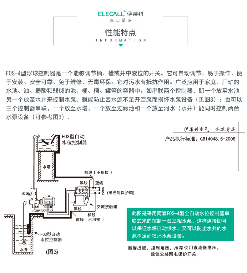 - Wide Compatibility: ELECALL FQS-4 Cable Float Switch is designed for versatile liquid level control, suitable for various applications requiring automatic water level detection.