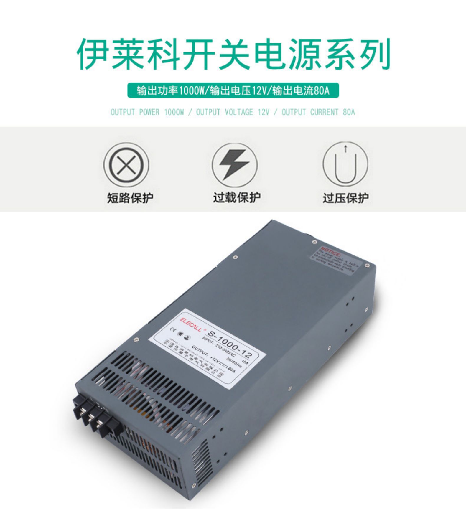 ELECALL S-1000/S-1200 Single Output Switching Power Supply for Industrial Automation (1000W-1200W, 12V 24V 36V 48V 110V 220V Output) with Overload, Overvoltage, Short Circuit Protection, CE Certified